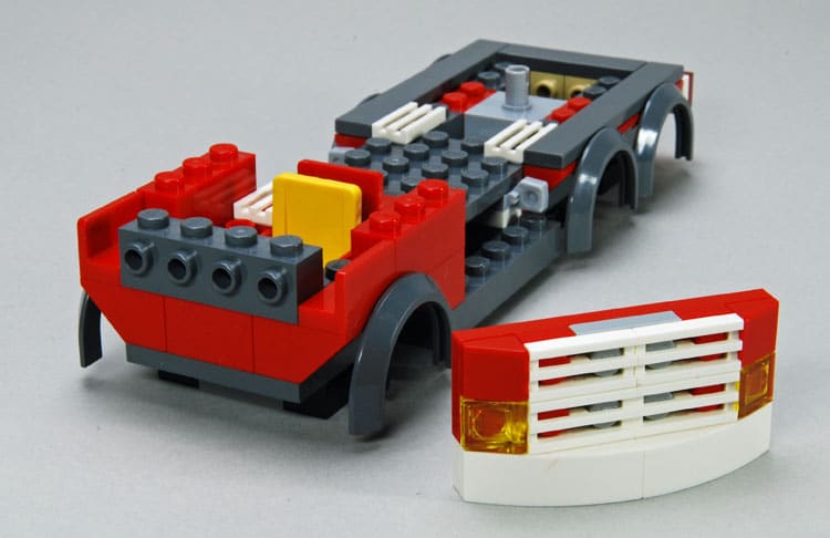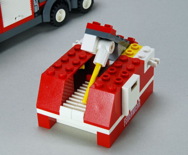 Der Truck war die erste Feuerwehr in sechser Noppenbreite, wenn wir von den alten Lenklastern aus den siebziger Jahren einmal absehen. Der Designer ging damals neue Wege beim Zusammenbau. Heute ist es üblich die Front und das Heck in Snot-Technik zu bauen.