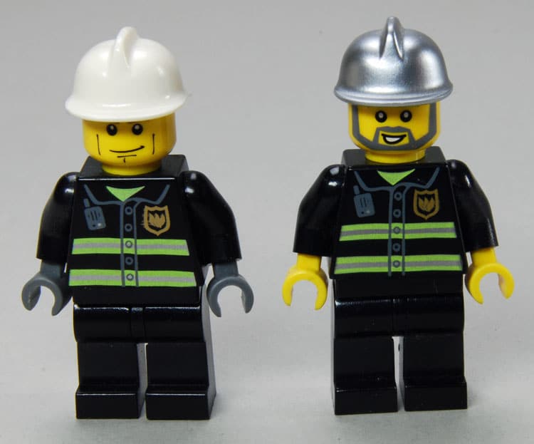 Im Set sind zwei Feuerwehrmänner dabei. Beide mit dem gleichen Oberkörper, bis auf die verschiedenen Handfarben. Die Feuerwehrhelme sind ein Relikt aus den Anfängen der Minifigur und seit 1978 so im Programm – bis heute!