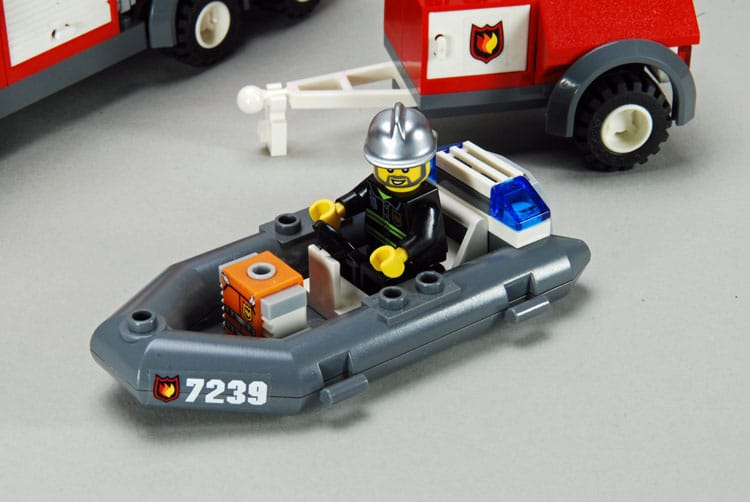 In den Staukästen befindet sich jeweils ein Feuerlöscher. Obenauf setzt der kleine Baumeister das Schlauchboot, welches übrigens kein neues Teil ist, denn es wird seit 1997 produziert.