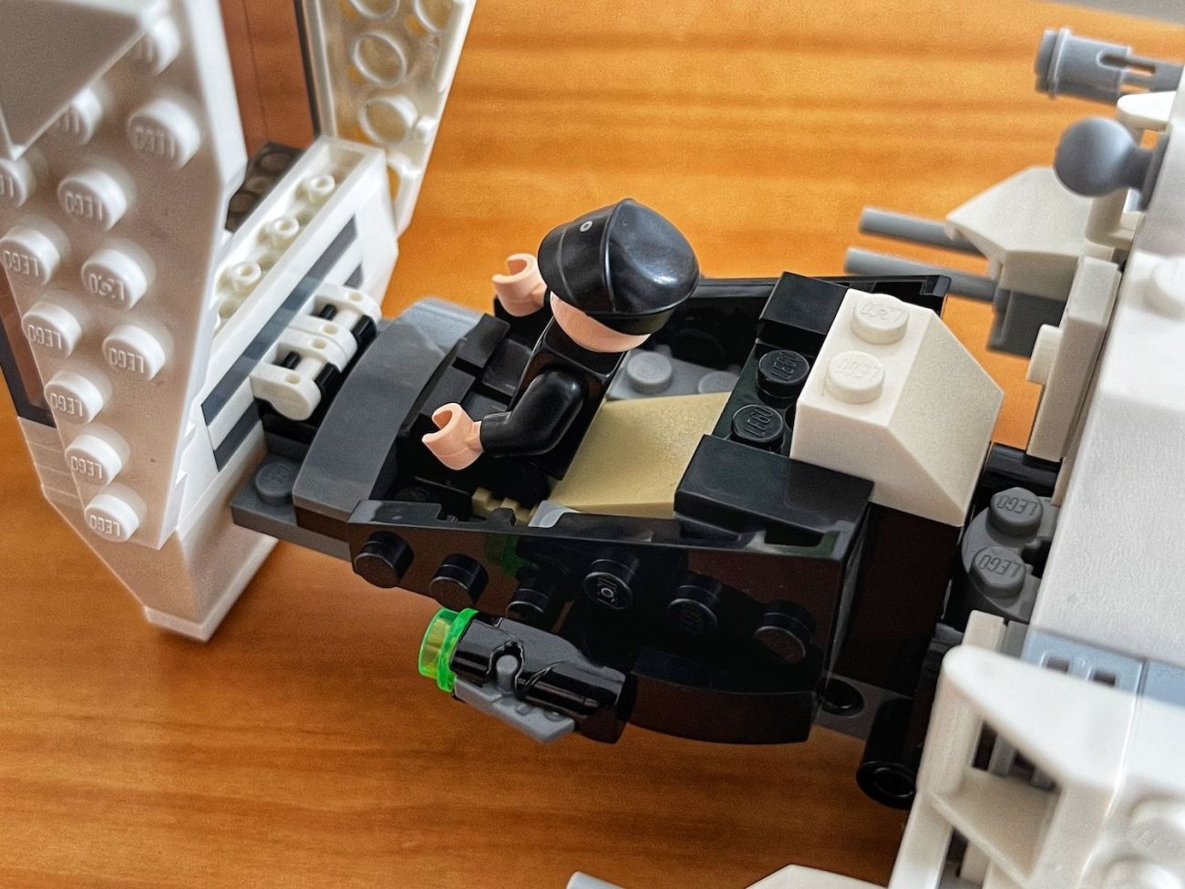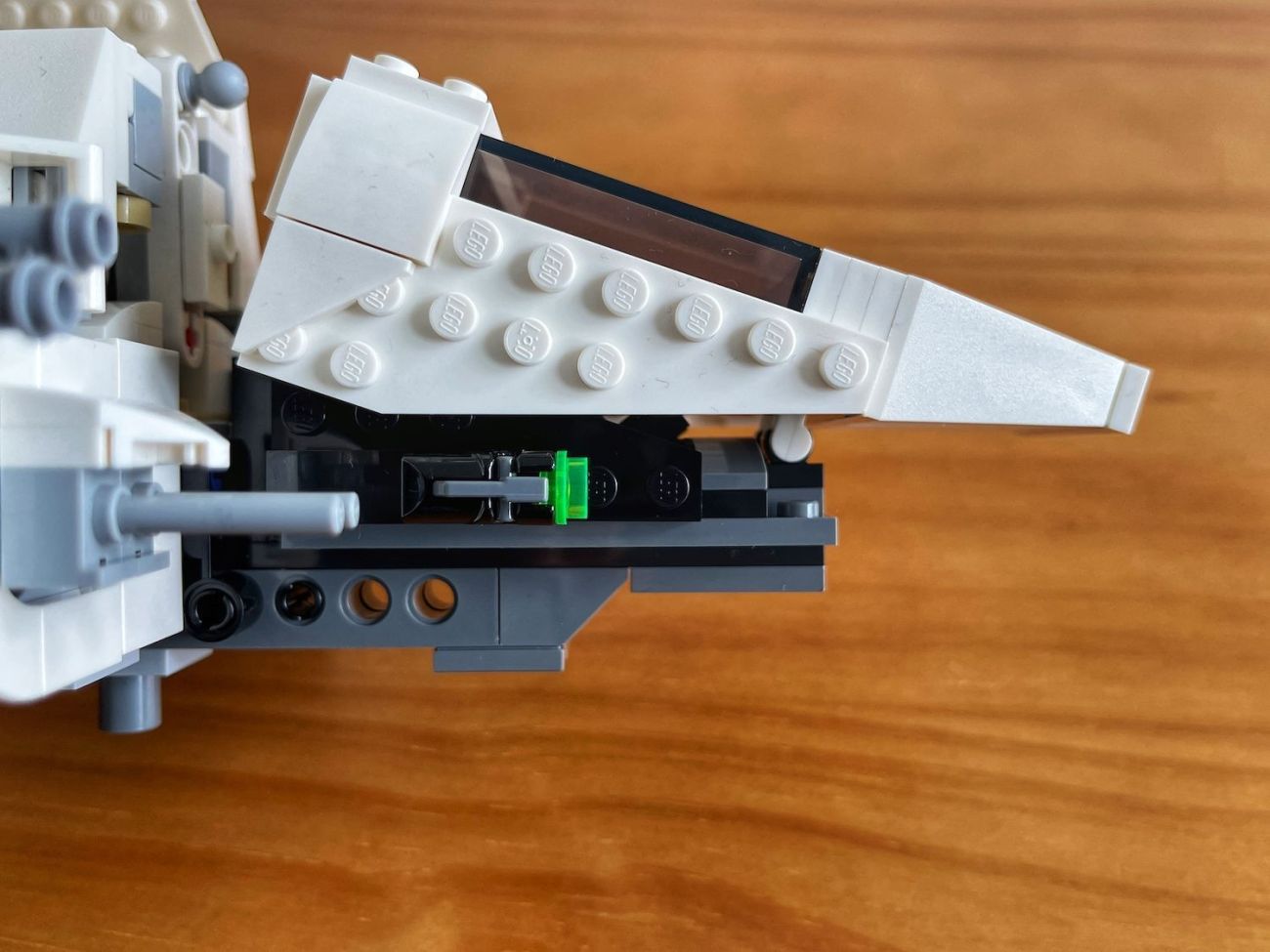 Leider offenbart sich am Cockpit auch die relativ geringe Teileanzahl des 75302 Imperial Shuttle. So gibt es einige „Luftlöcher“, die man aus vielen Winkeln sehen kann. Und auch der unverkleidete dunkelgraue Bereich unter dem eigentlichen Cockpit mag mir nicht recht gefallen.