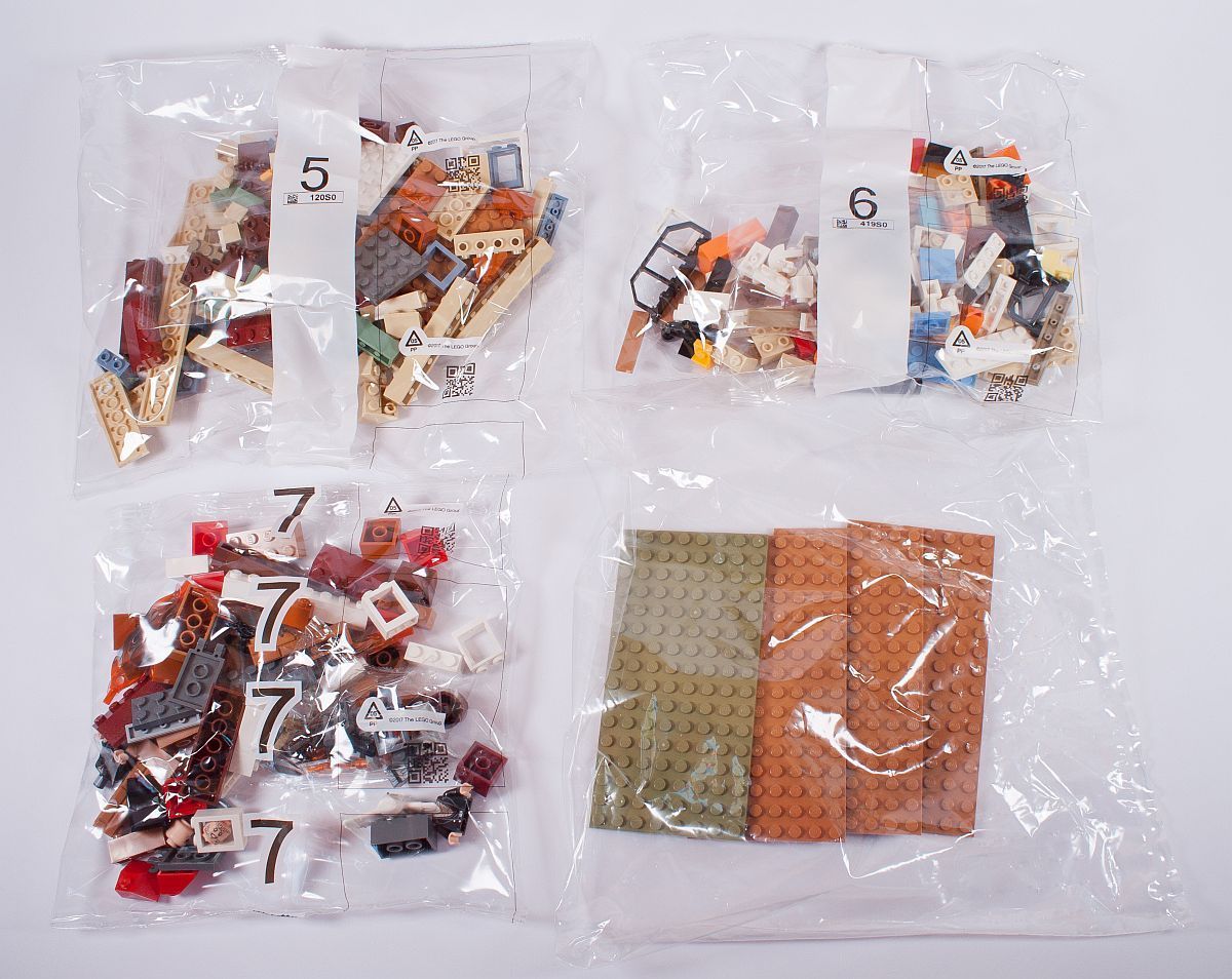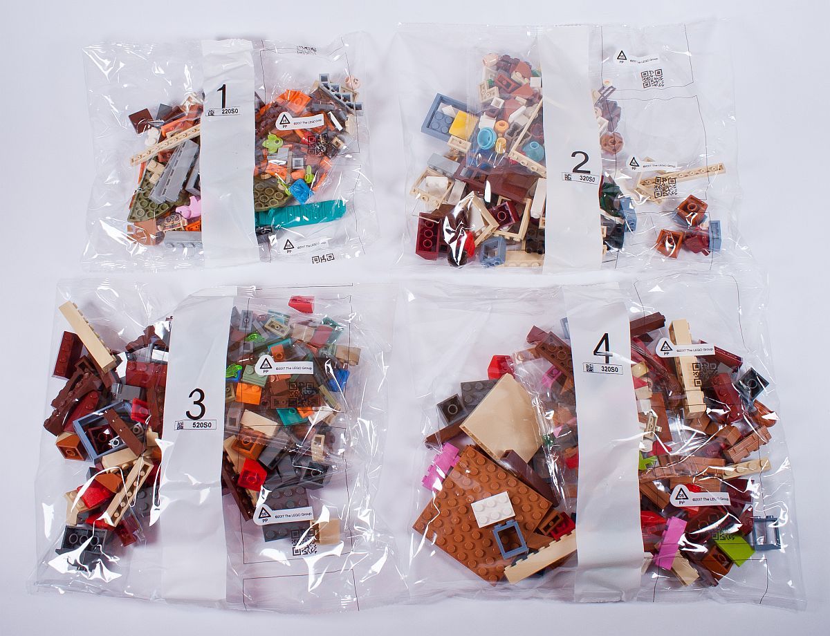 Zum Öffnen der Box müssen an diesem Set lediglich zwei Klebestreifen durchtrennt werden. Dies ist sehr löblich. Die knapp über 1.000 Einzelsteine verteilen sich auf sieben nummerierte Knistertüten, sowie einen extra Beutel mit vier 8×16 noppenstarken Platten.