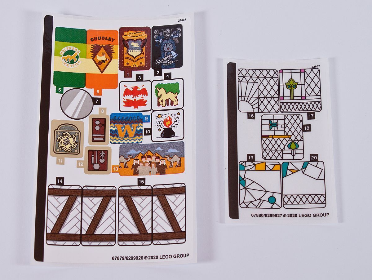 Eine klebegebundene Bauanleitung liegt ebenso bei, wie zwei Stickerbögen mit insgesamt 22 Abziehbildchen. Da war ich erst mal etwas schockiert, dass es doch so viele sind. Ein paar bedruckte (Standard-) Elemente gibt es aber auch, dazu später mehr. Schade, dass bei diesem exklusiven Set nicht noch ein bisschen mehr Hauch an exklusiv bedruckten Steinen vorhanden ist.