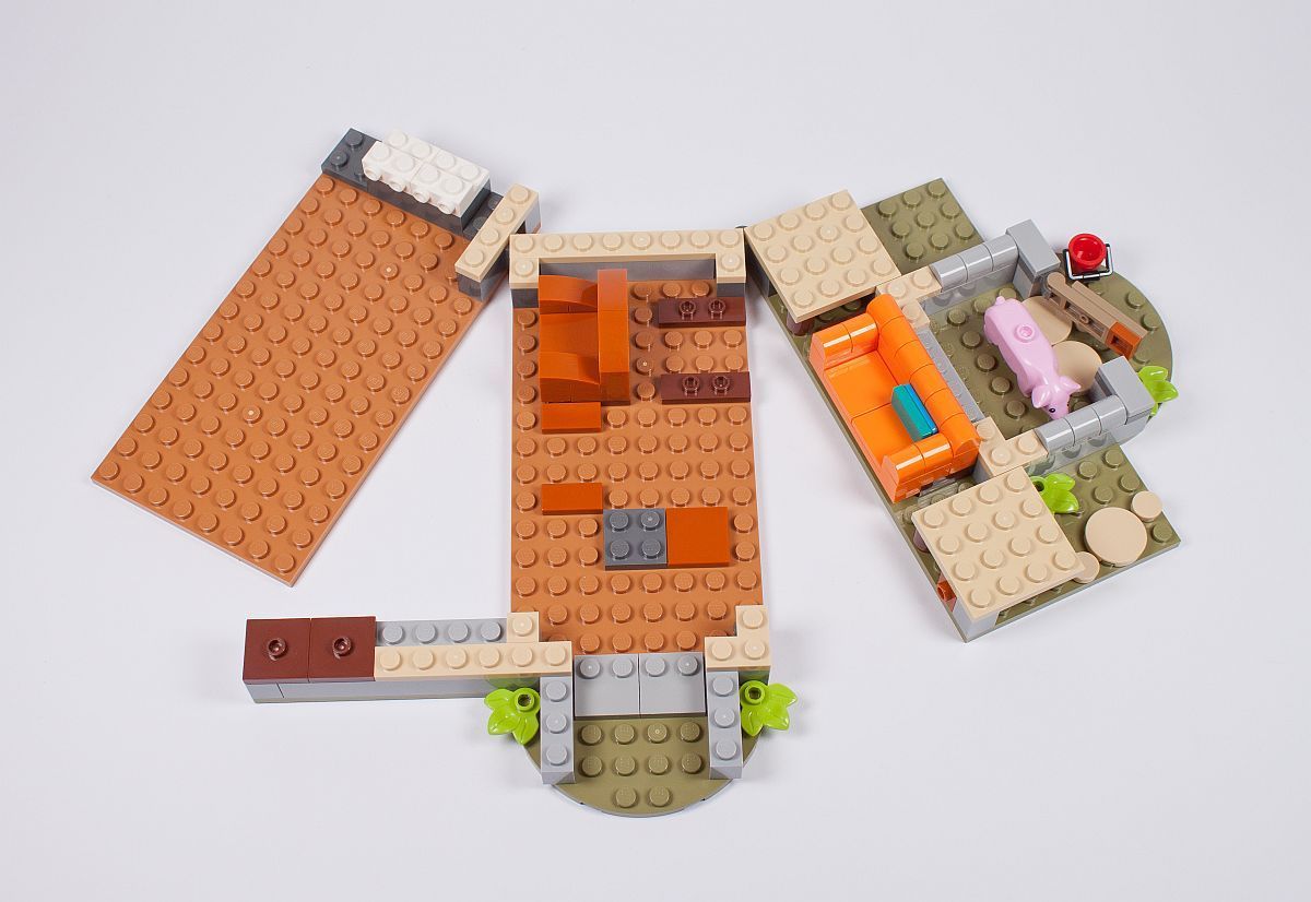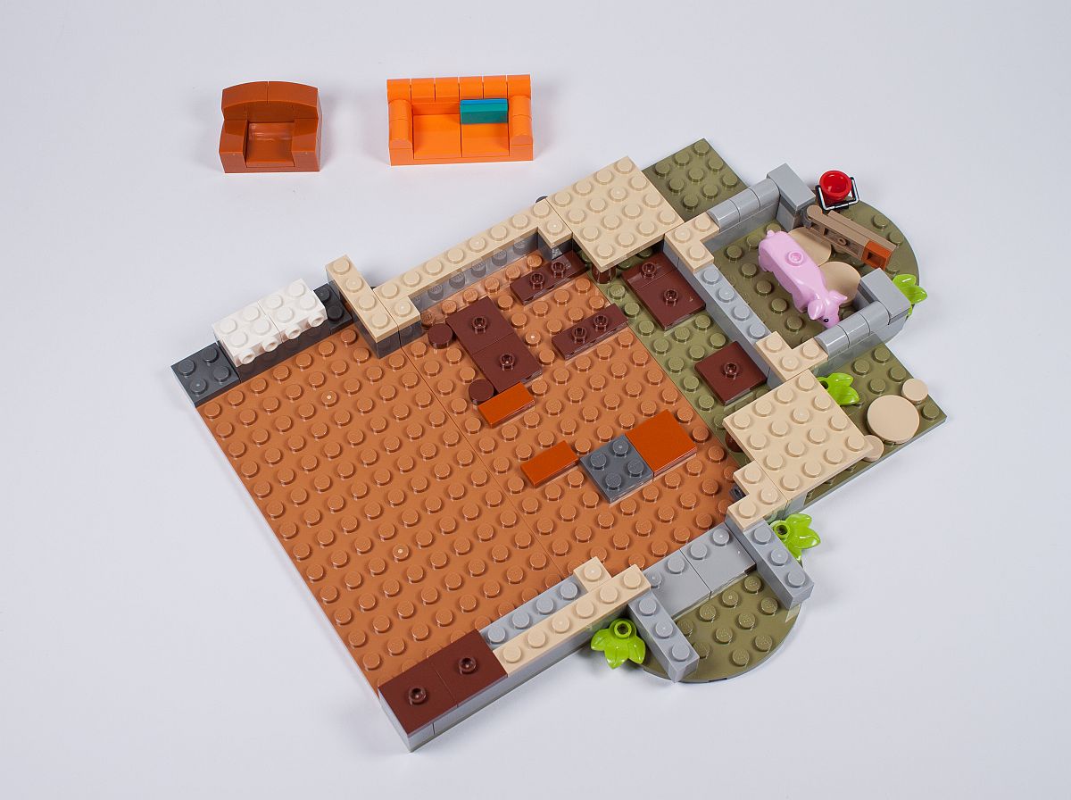 Doch genug zu den Minifiguren, kommen wir zum Fuchsbau und dieser wurde sehr gut umgesetzt, so viel sei schon mal gesagt. Begonnen wird mit einer Dreiteilung des Bodens. So lässt sich später das Gebäude besser öffnen und bespielen. Es entsteht ein Teil des Schweinestalls, samt rosa Schwein, wie wir es zuletzt auch bei der LEGO Ideas Pirates of Barracuda Bay (21322) schon gesehen haben. Auch ein Sessel und eine Couch entstehen bereits im Wohnzimmer.