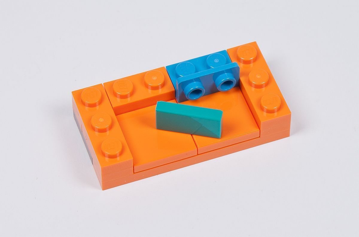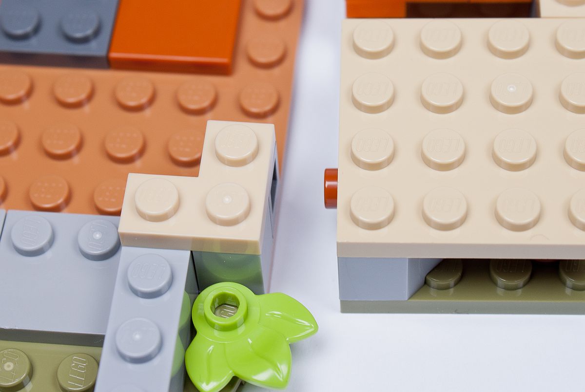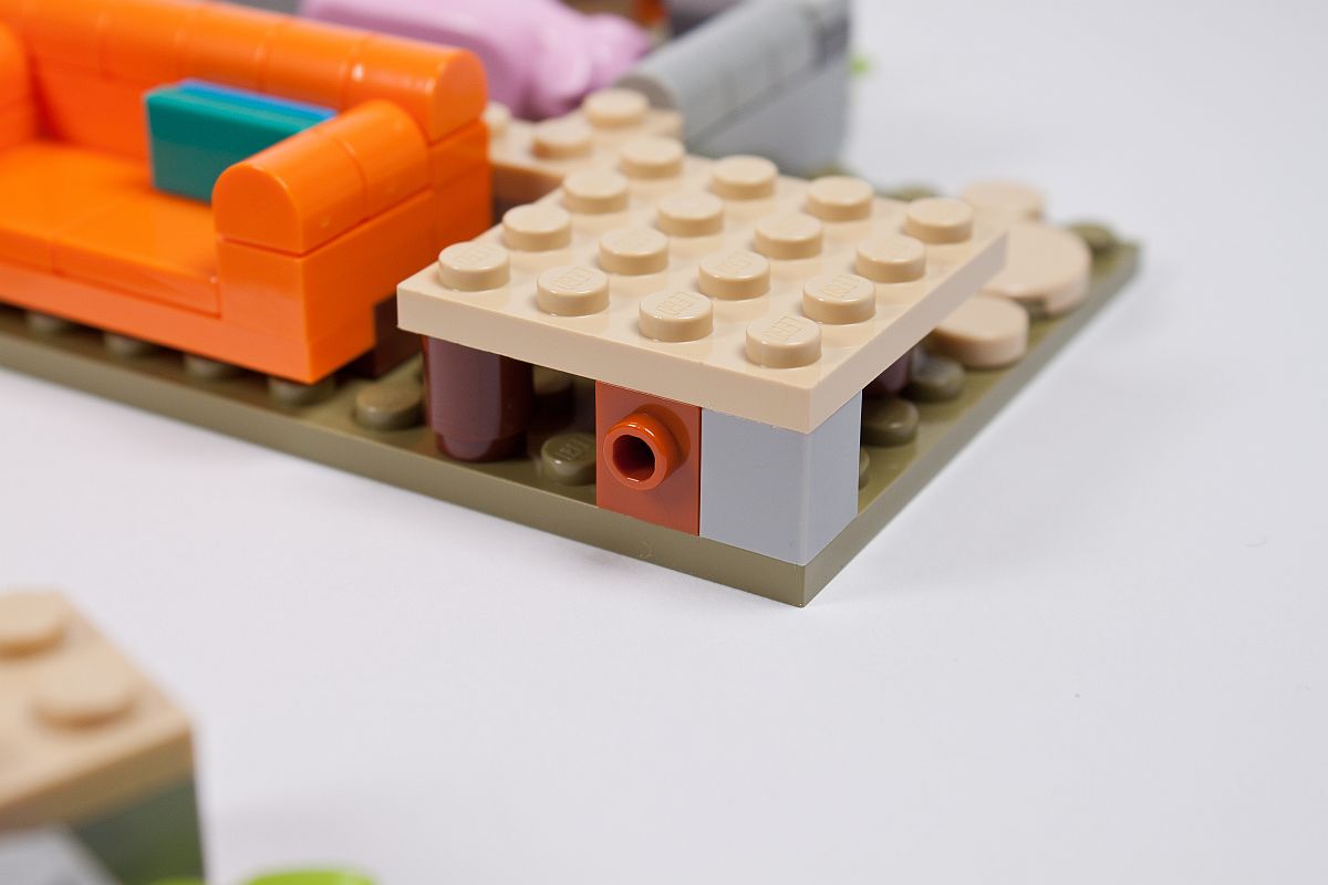 Eine ebenfalls nette Idee ist die Befestigung von zumindest einer der beiden beweglichen Bodenplatten. Diese wird nicht etwa durch Pins am Mittelstück des Bodens arretiert, sondern mit einer Noppe. Dies funktioniert tatsächlich ganz gut – leider haben die Designer es nur bei der einen Seite integriert, die andere Bodenplatte mit dem späteren Esstisch bleibt dagegen sehr leicht beweglich und hat keine Befestigung.