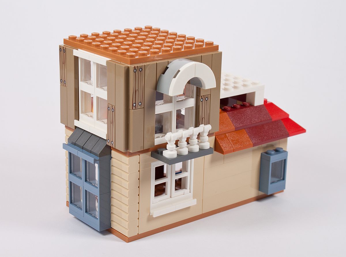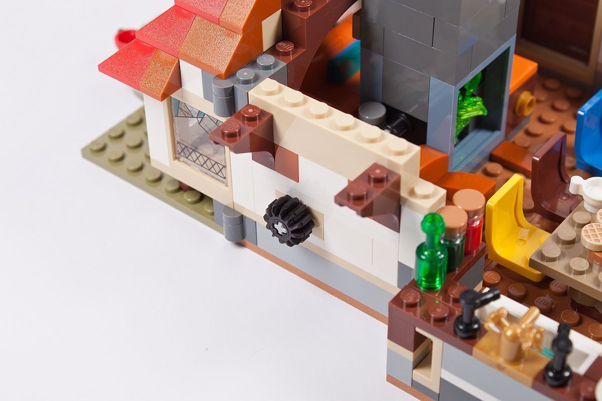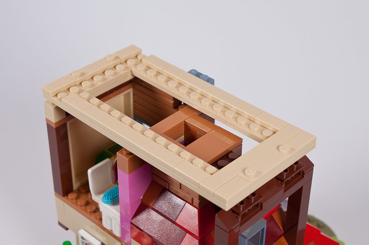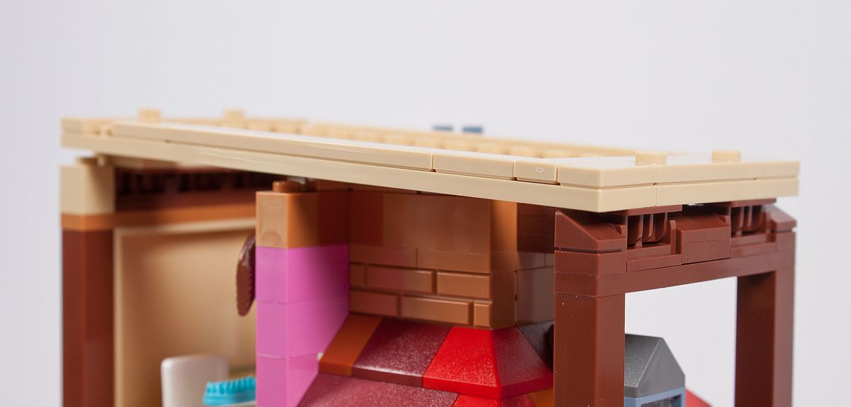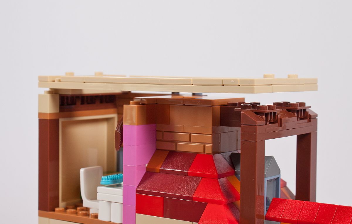 Die Außenfassade erinnert in diesem Fall sehr an einen Brickhead, aber die Verwendung von SNOT (Studs Not On Top) wird bei vielen aktuellen Modellen immer beliebter als Bauweise. An die Noppen kommen dann Fliesen, wovon einige in Holzoptik bedruckt (!) sind. Ein kleines Geländer aus Skelett-Füßen entsteht, genauso wie ein Rundbogen über dem Fenster.