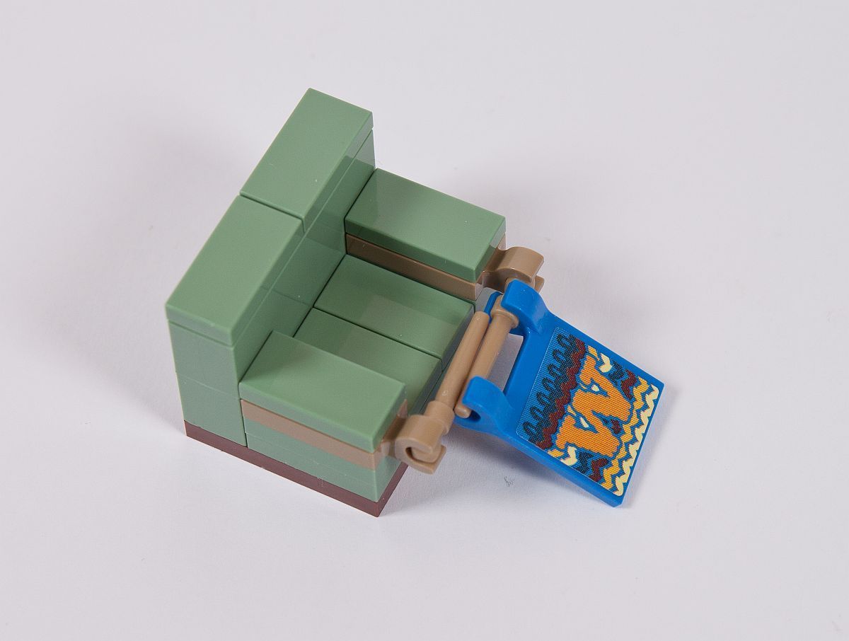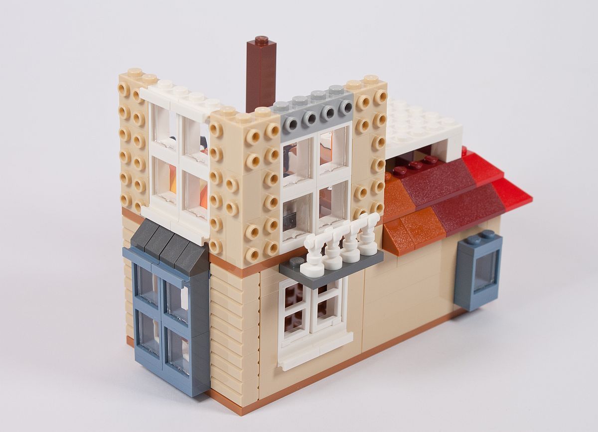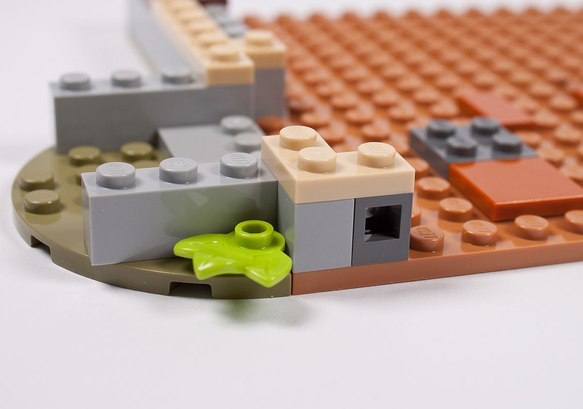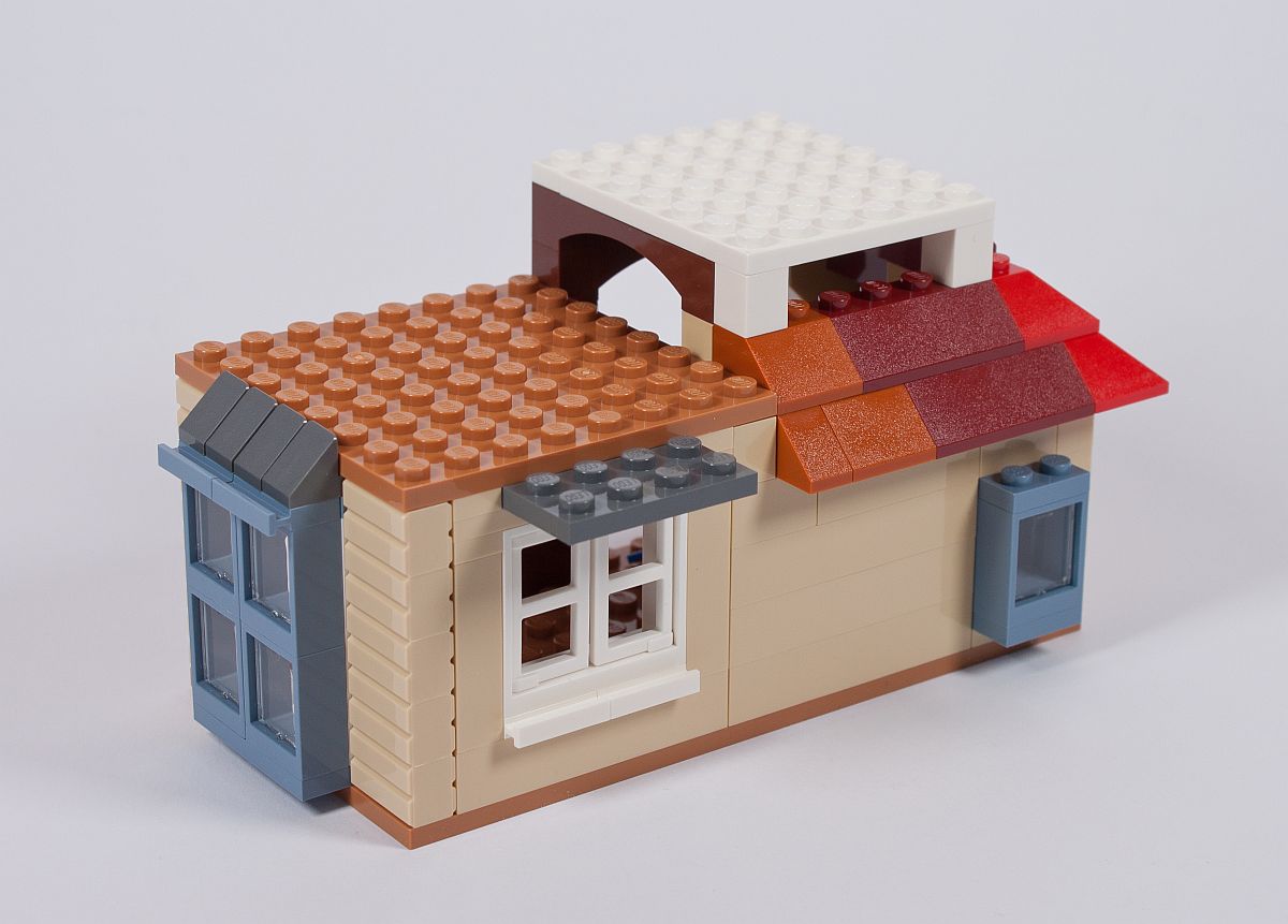 Die Außenfassade erinnert in diesem Fall sehr an einen Brickhead, aber die Verwendung von SNOT (Studs Not On Top) wird bei vielen aktuellen Modellen immer beliebter als Bauweise. An die Noppen kommen dann Fliesen, wovon einige in Holzoptik bedruckt (!) sind. Ein kleines Geländer aus Skelett-Füßen entsteht, genauso wie ein Rundbogen über dem Fenster.