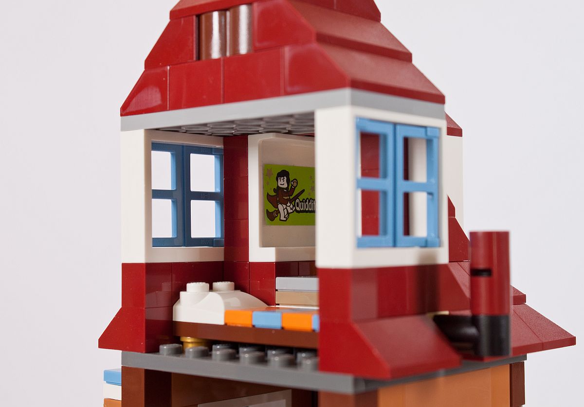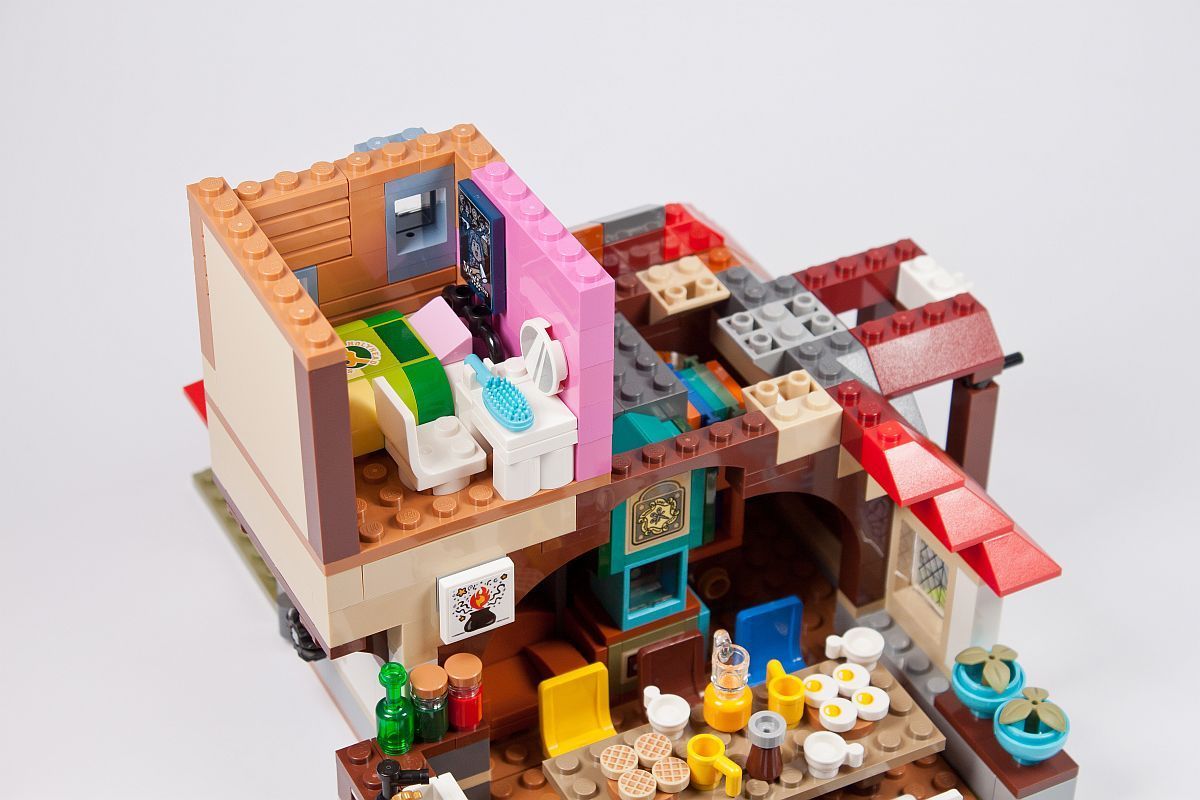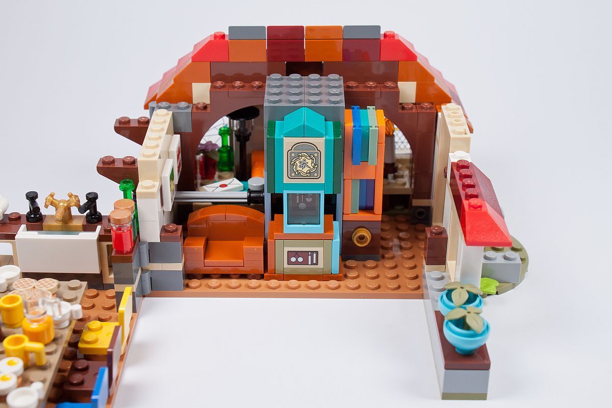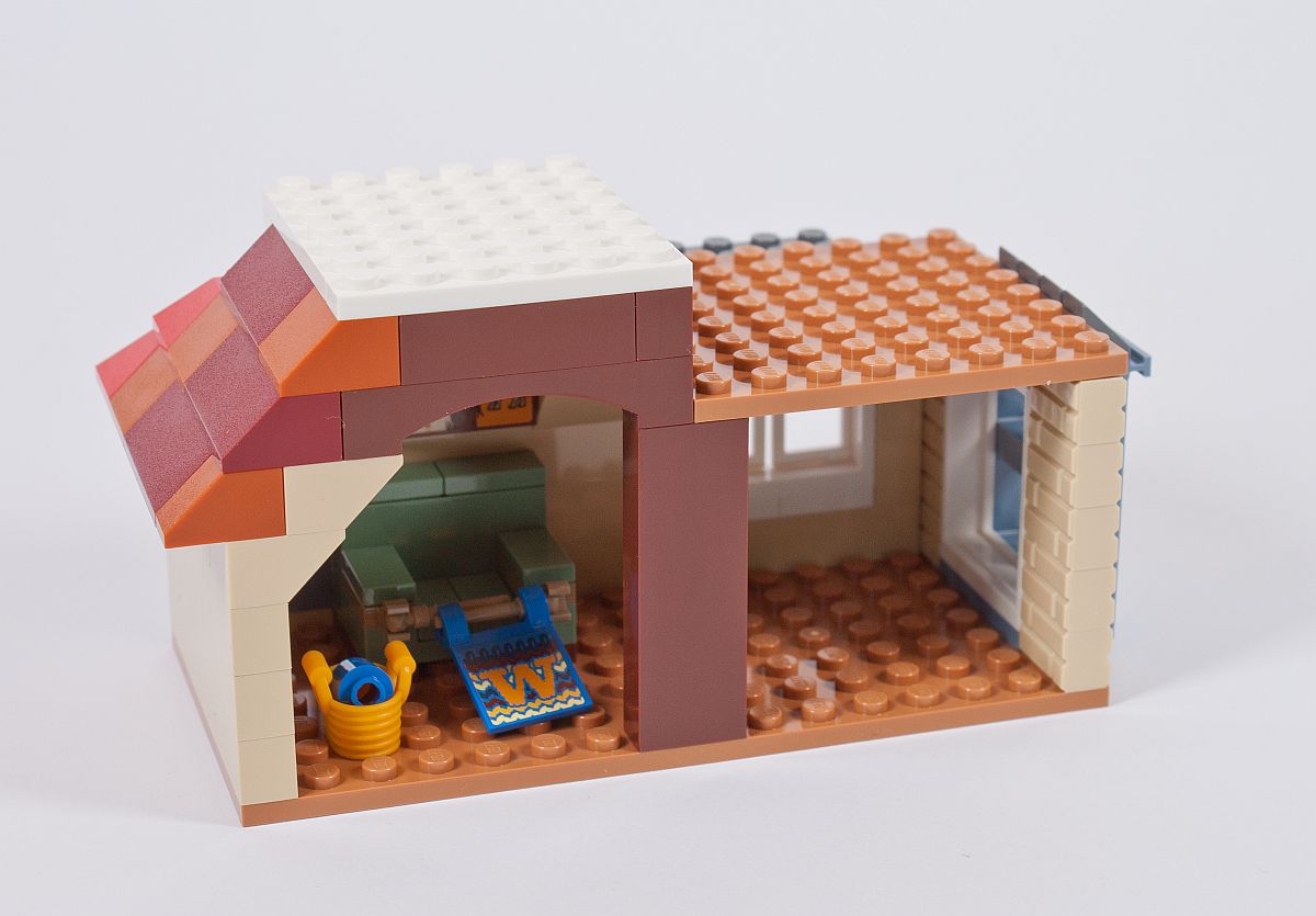 Es gibt einige Szenen, in denen die Weasleys an ihrem Esstisch sitzen, so darf dieses wichtige Element natürlich auch in diesem Set nicht fehlen. Reich gedeckt und mit bunten Stühlen versehen kommt es dem Original doch schon sehr nah! Im Außenbereich beginnen bereits die ersten bunten Dachsteine ihren Weg in die Höhe zu nehmen.