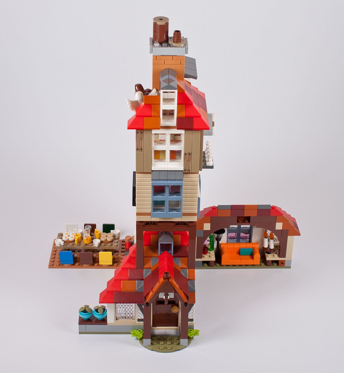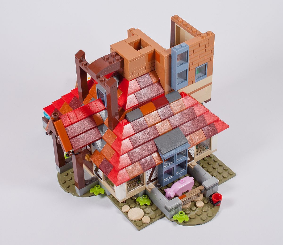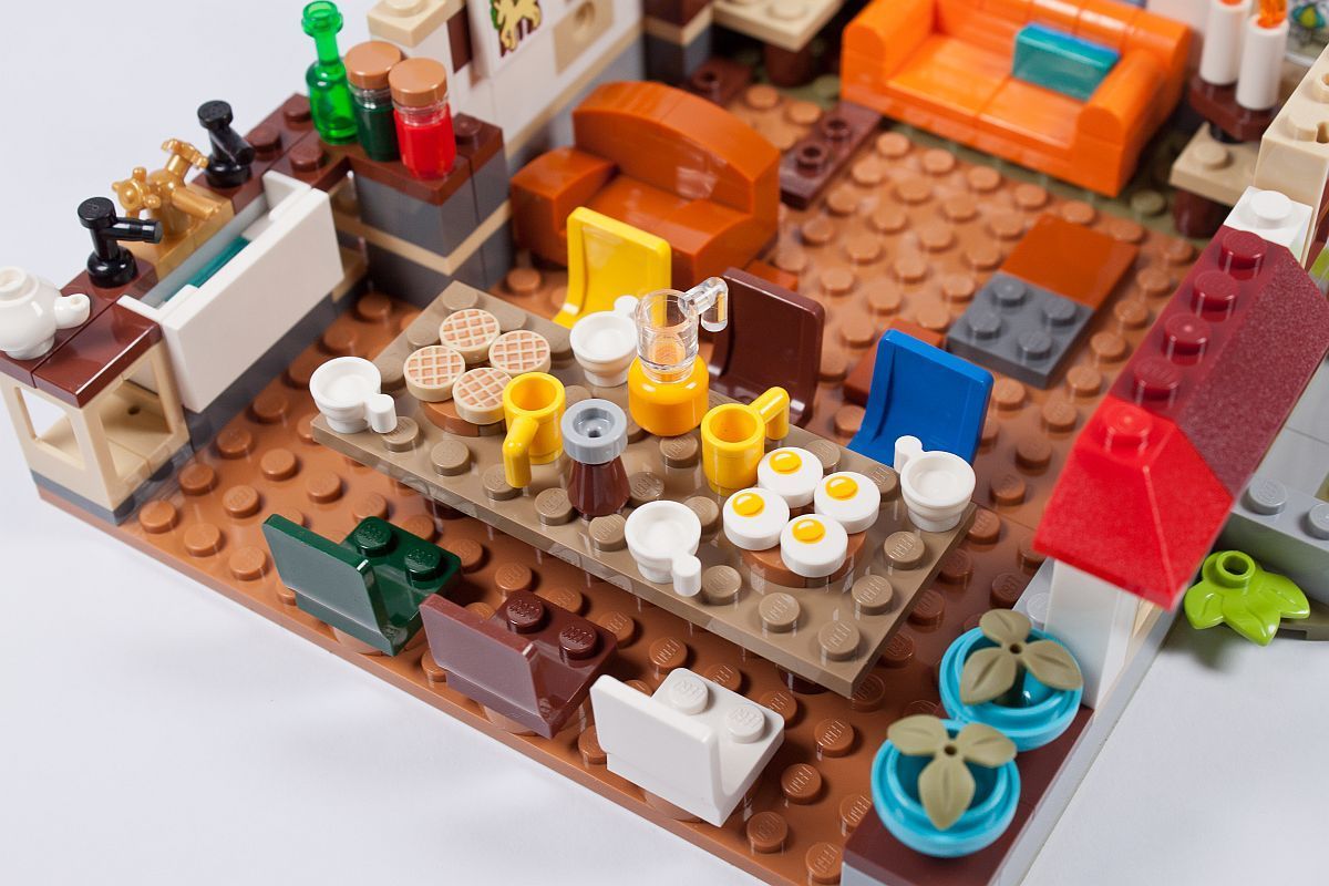 Es gibt einige Szenen, in denen die Weasleys an ihrem Esstisch sitzen, so darf dieses wichtige Element natürlich auch in diesem Set nicht fehlen. Reich gedeckt und mit bunten Stühlen versehen kommt es dem Original doch schon sehr nah! Im Außenbereich beginnen bereits die ersten bunten Dachsteine ihren Weg in die Höhe zu nehmen.
