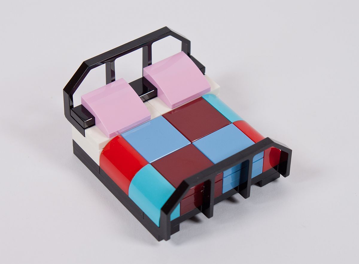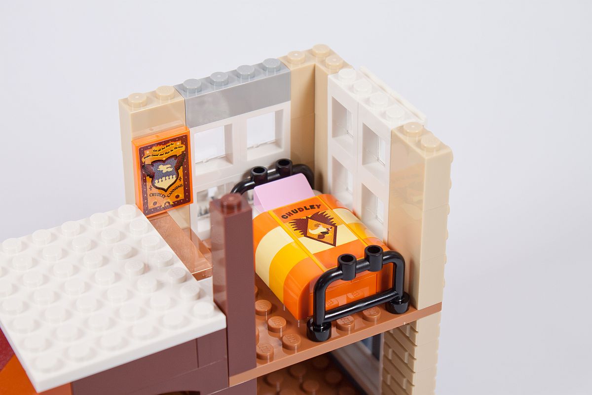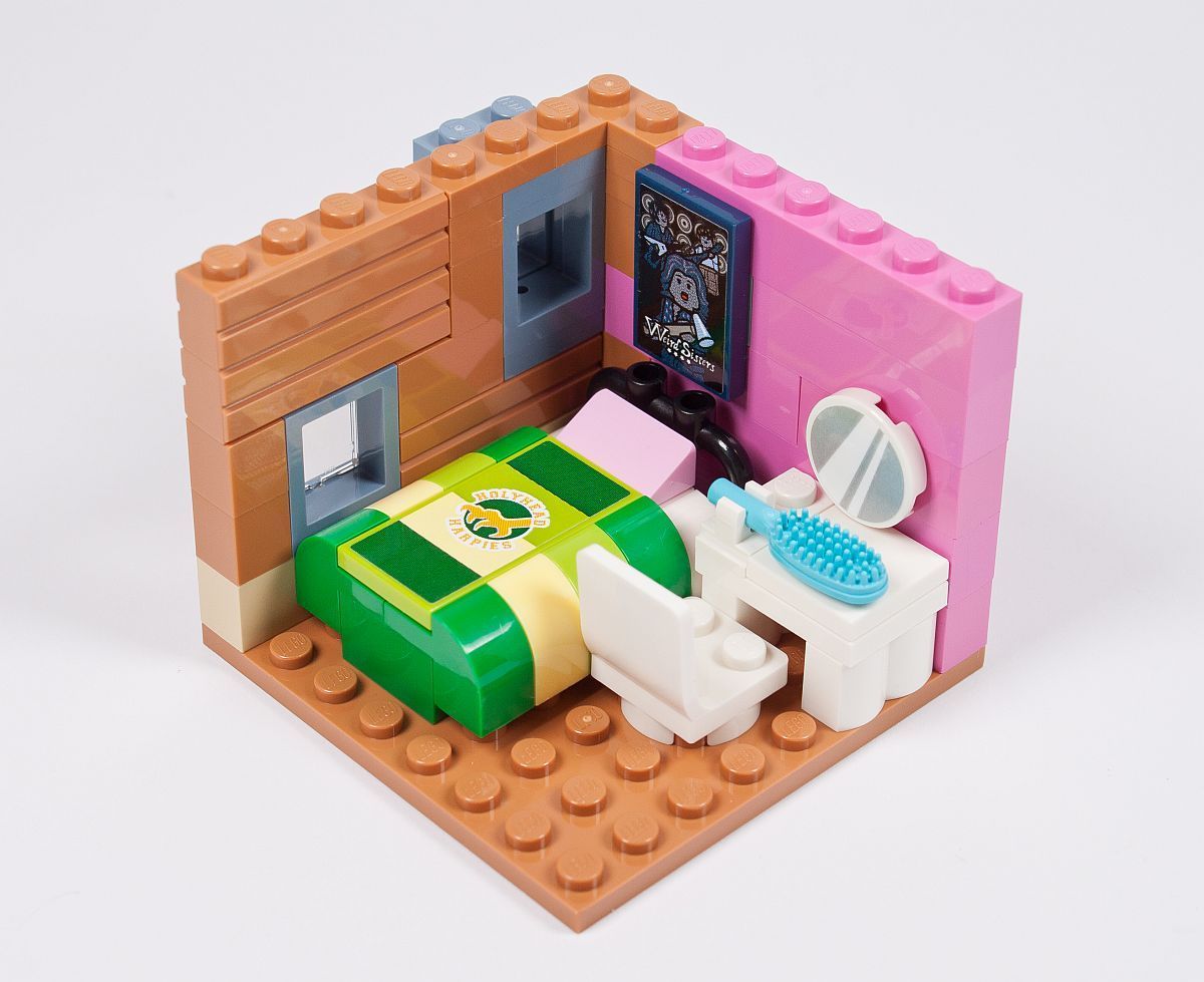 Ab jetzt wird in die Höhe gebaut. Zuerst entsteht das Zimmer von Ginny Weasley. Sie ist Fan vom Quidditch-Team der Holyhead Harpies. Daher auch die grün gestreifte Bettdecke. Leider ist das Dunkelgrün des Stickers auf der 2×4 Fliese nicht annähernd das Gleiche, wie das der Steine. An der Wand hängt noch ein Poster der Weird Sisters, eine Rockband im Harry Potter Universum. Der kleine Raum wird anschließend auf das vorhandene Gebäude geklemmt.