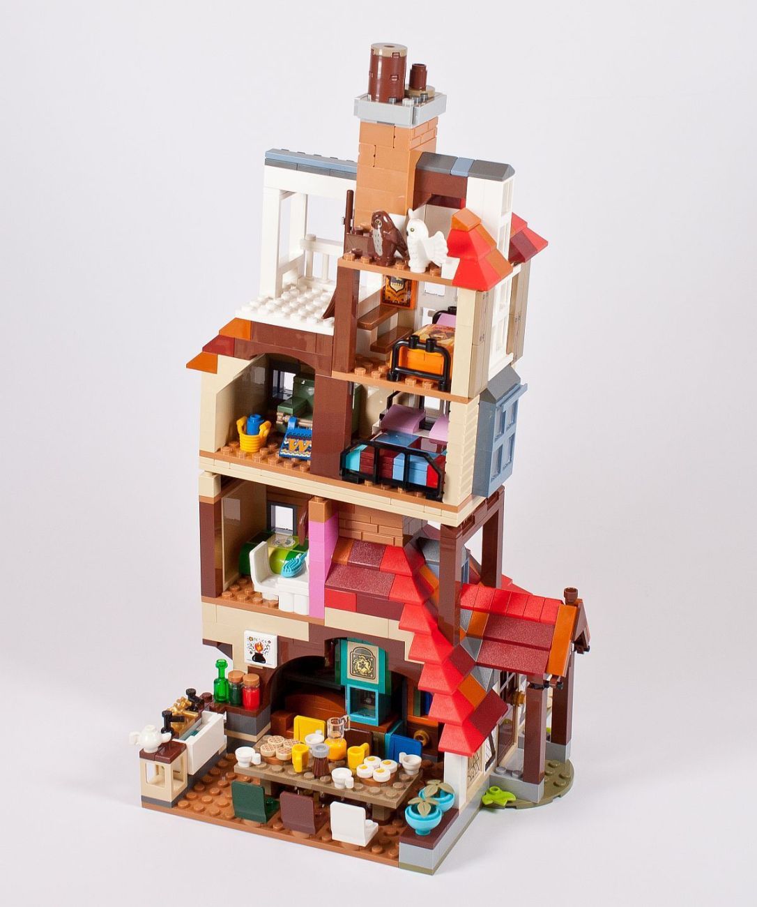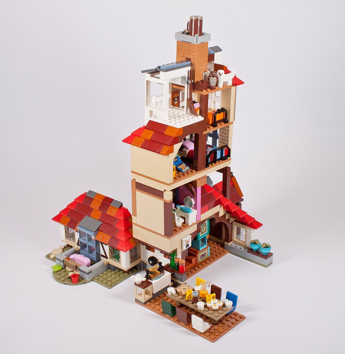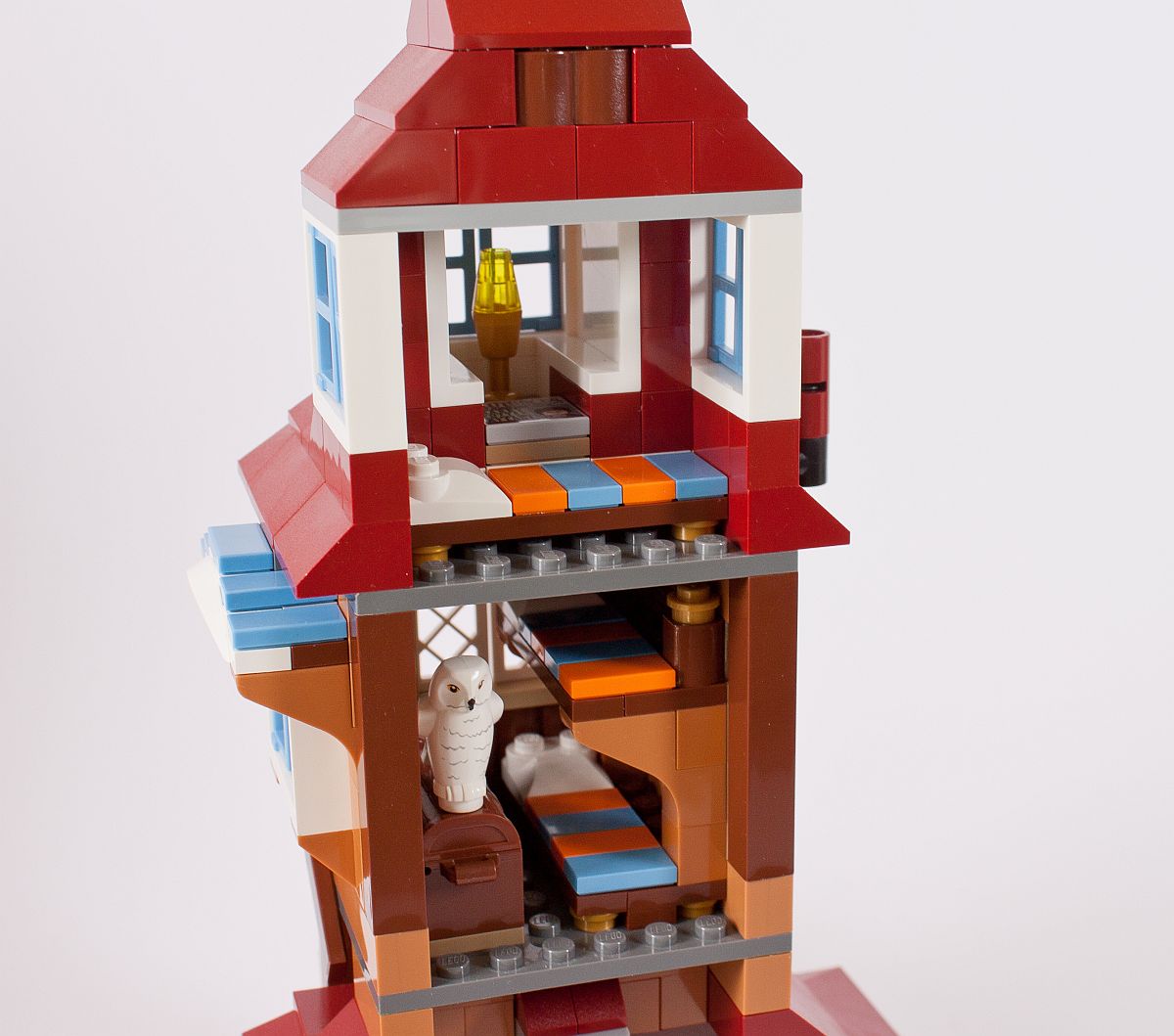 Zu guter Letzt noch der Dachabschluss und zwei Schornsteine. Eigentlich hat das Gebäude mindestens vier dieser Rauchabzüge, aber bei diesem Modell wurde sich auf zwei beschränkt. Die kleine Veranda darf ebenso nicht fehlen. Auch kommen nun die zwei Eulen zu ihrem Einsatz. Ich habe diese nicht extra bei den Minifiguren mit aufgeführt, da diese jeder kennen sollte. Hierbei handelt es sich um die neue weiße Version von Hedwig, der Eule von Harry, und eine braune Eule, die vermutlich Errol darstellt – die „Hauseule“ von den Weasleys. Eigentlich ist diese mehr grau, warum sie nun in diesem Set braun ist?!