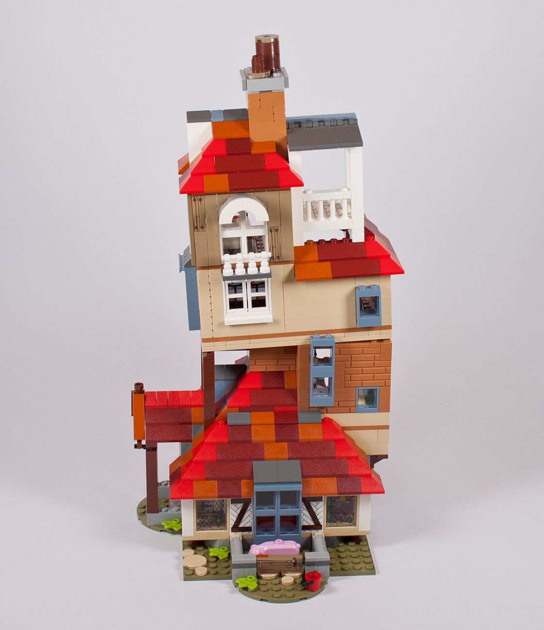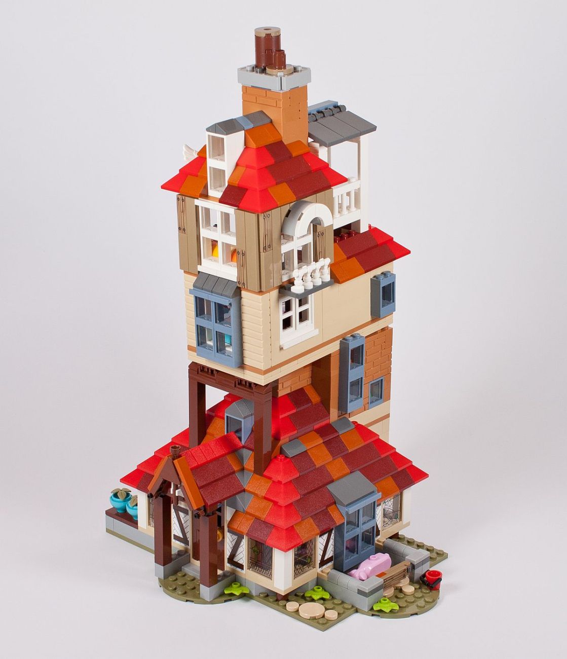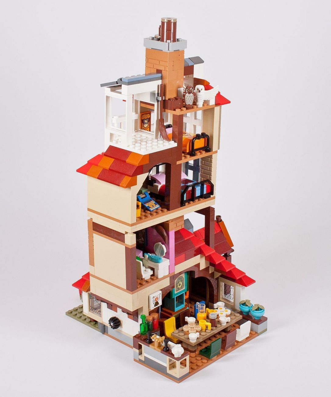Zu guter Letzt noch der Dachabschluss und zwei Schornsteine. Eigentlich hat das Gebäude mindestens vier dieser Rauchabzüge, aber bei diesem Modell wurde sich auf zwei beschränkt. Die kleine Veranda darf ebenso nicht fehlen. Auch kommen nun die zwei Eulen zu ihrem Einsatz. Ich habe diese nicht extra bei den Minifiguren mit aufgeführt, da diese jeder kennen sollte. Hierbei handelt es sich um die neue weiße Version von Hedwig, der Eule von Harry, und eine braune Eule, die vermutlich Errol darstellt – die „Hauseule“ von den Weasleys. Eigentlich ist diese mehr grau, warum sie nun in diesem Set braun ist?!