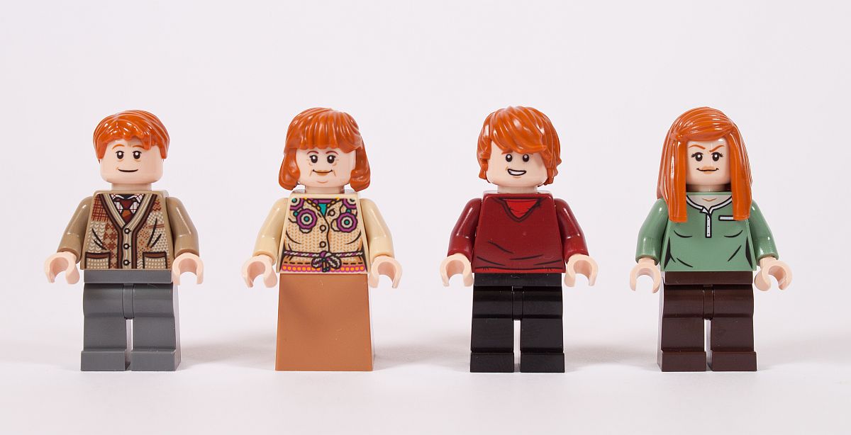 Starten wir mit den Bewohnern des Fuchsbaus – oder zumindest einem Teil der Familie Weasley. Ins Set geschafft haben es (von links nach rechts):