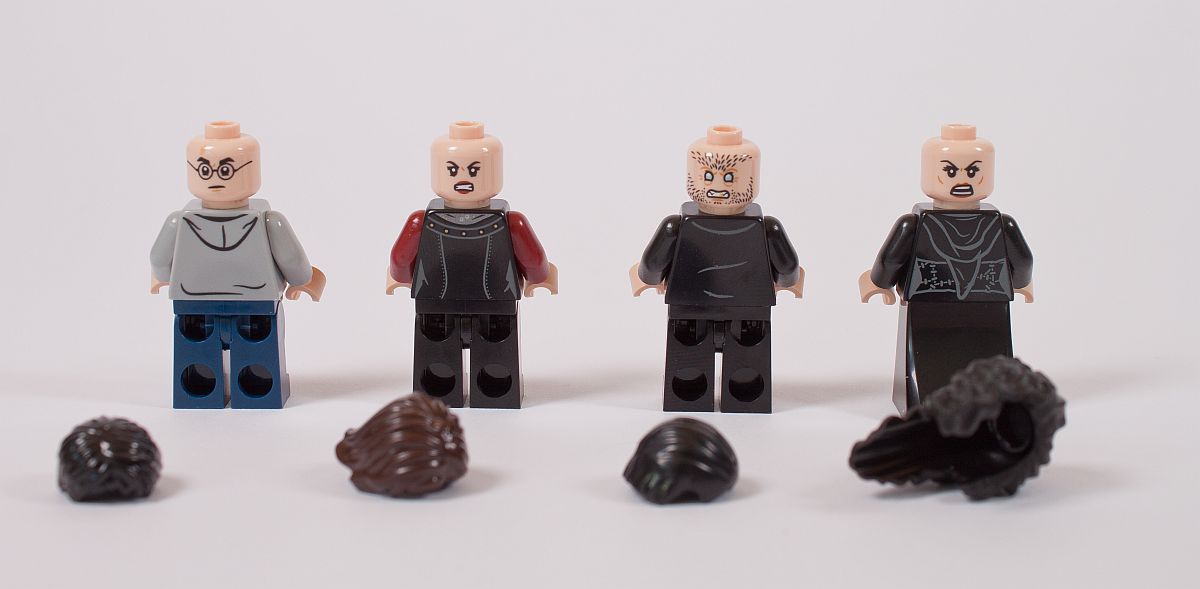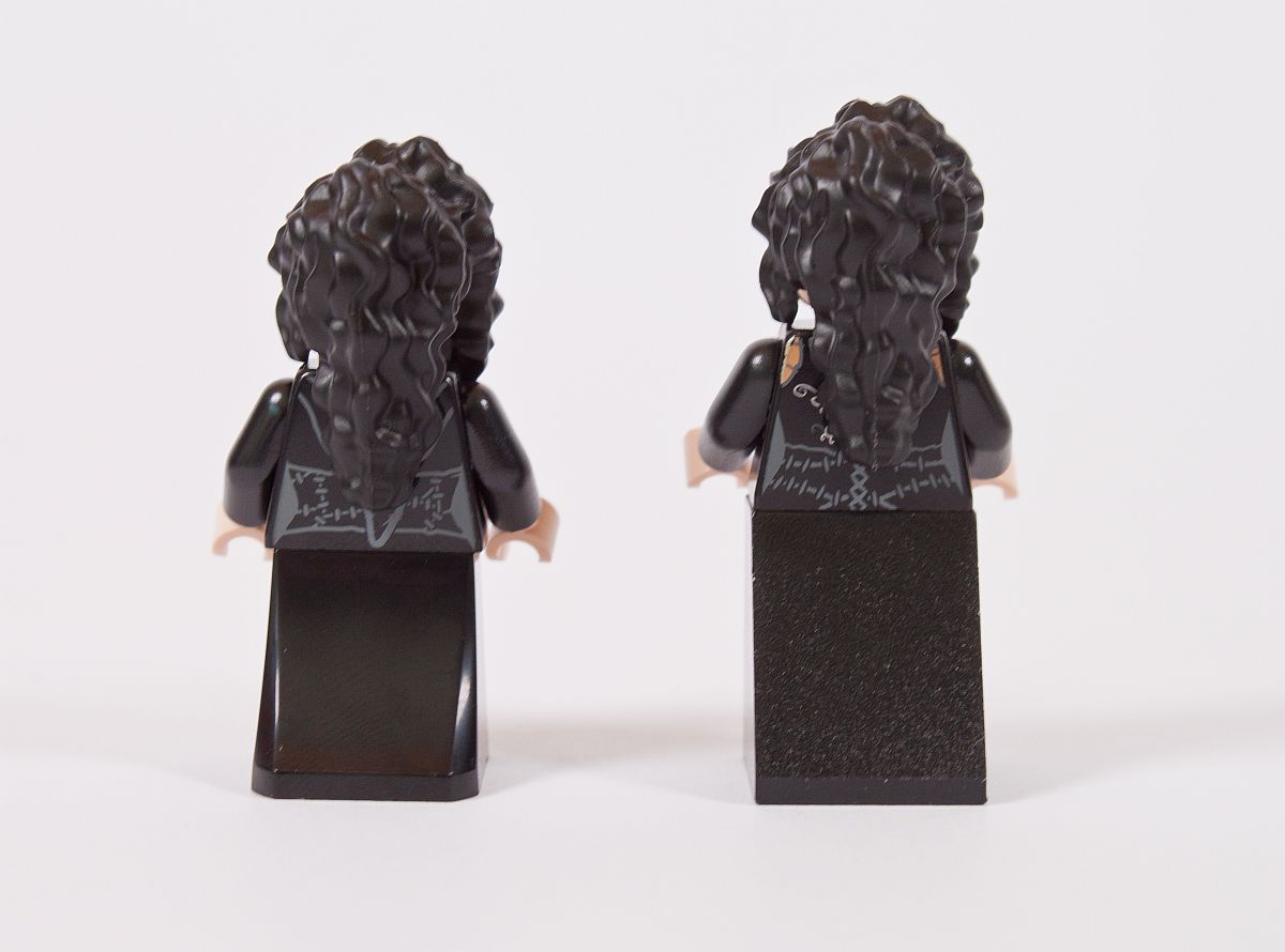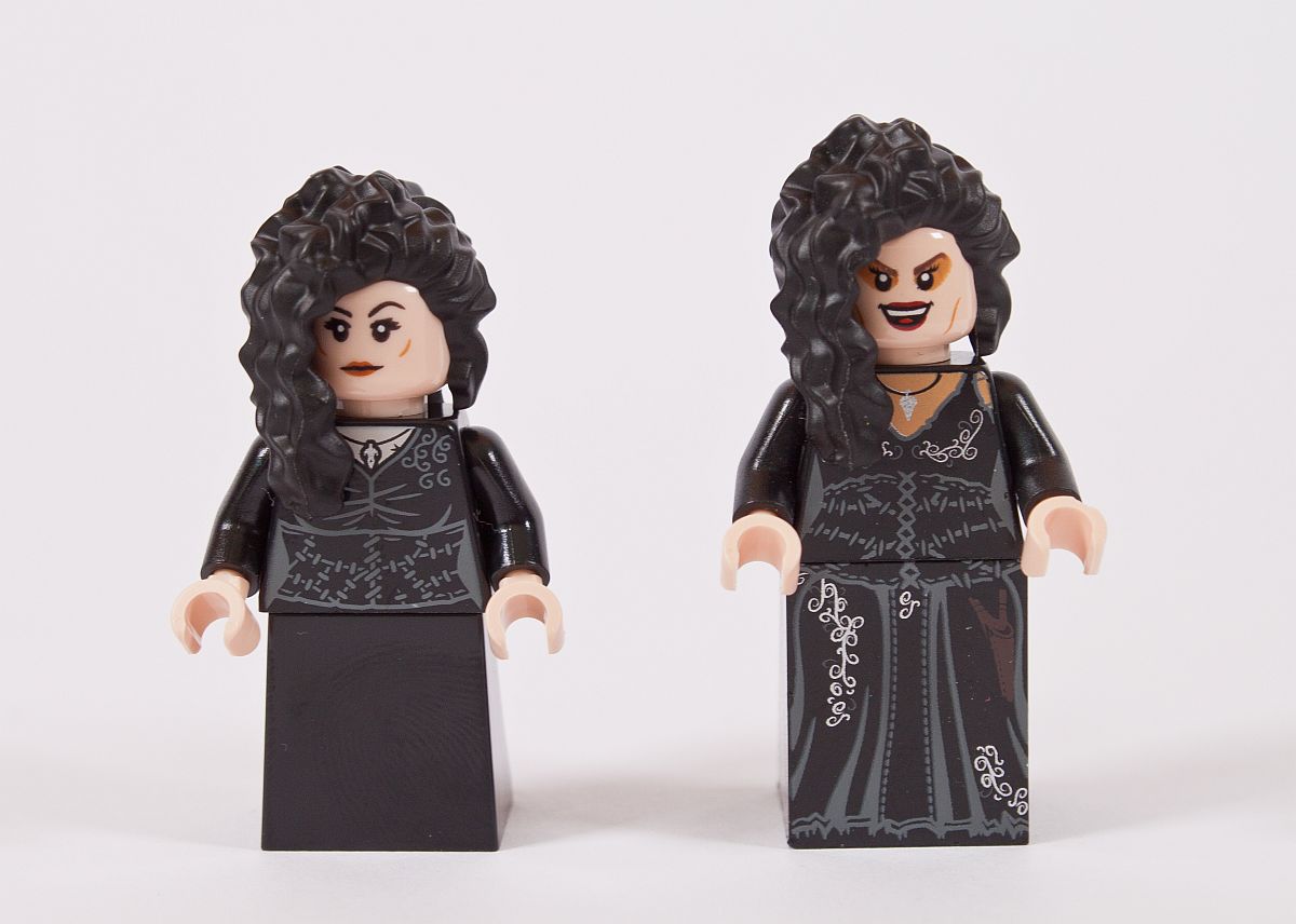 Alle Figuren erhalten ebenfalls einen Zauberstab. Zum Abschluss der Minifiguren noch einige Worte zu den Prints bzw. Designs der Figuren. Es gibt für mich eine große allgemeine Enttäuschung – bis auf die Hosenbeine von Greyback sind keine weiteren Unterteile der Figuren bedruckt. Gerade bei den Röcken von Molly und Bellatrix ist es bedauerlich, dass es Blanko-Steine ohne weitere Details sind. Warum? Vor zehn Jahren hat es LEGO deutlich besser gemacht, das zeigt der Vergleich am Ende des Reviews. Auch die Standard-Beine von Arthur passen nicht zum halb abgeschnittenen, doch recht schön bedruckten Oberteil. Beim Gesicht von Bellatrix wurde sich auch bei der Erstauflage deutlich mehr Mühe gegeben und ein optisch besseres Bild zur Figur geschaffen.