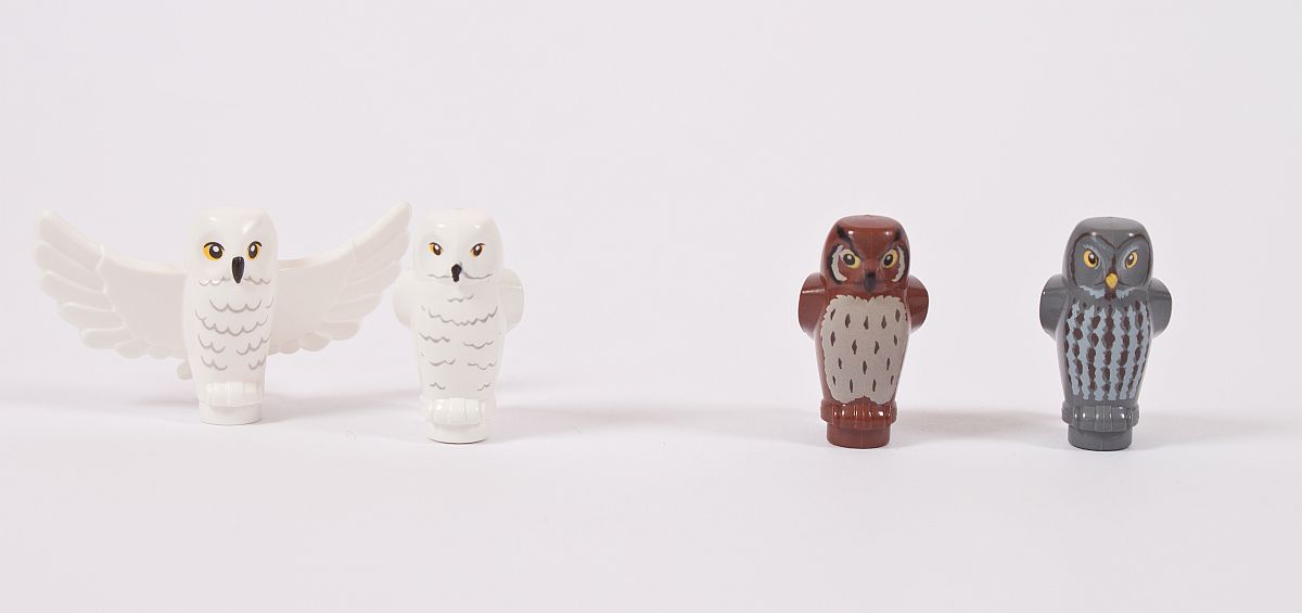 Bei den Eulen wurde Hedwig quasi lebendiger gestaltet – Errol dagegen hat vermutlich durch eine Mauser sein graues Federkleid gegen ein Braunes verloren. Ich denke, eine neue graue Eule hätte hier besser gepasst.
