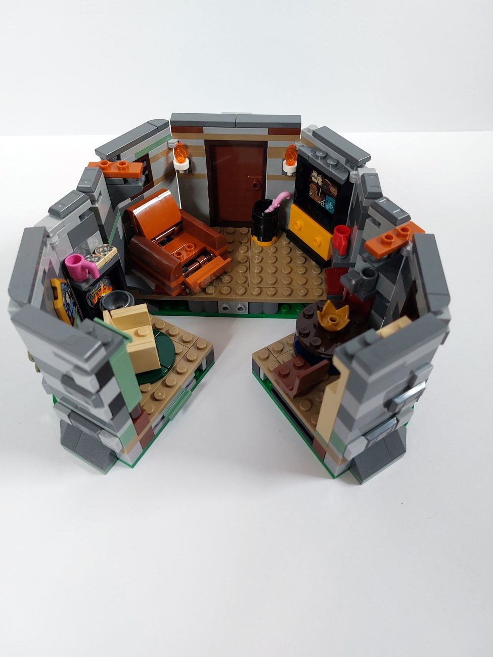 Als freistehenden Anbau erhält man Fangs Hundehütte, zum Verbinden mit der Hütte ein Fass auf dem Draco Malfoy durch das Fenster spähen kann (dafür muss man es allerdings andersrum anordnen als LEGO in der Anleitung) und zwei Kürbisse. Hier kann man stattdessen auch das gleichzeitig erschienene Set 76432 Der verbotene Wald: Magische Geschöpfe verbinden.