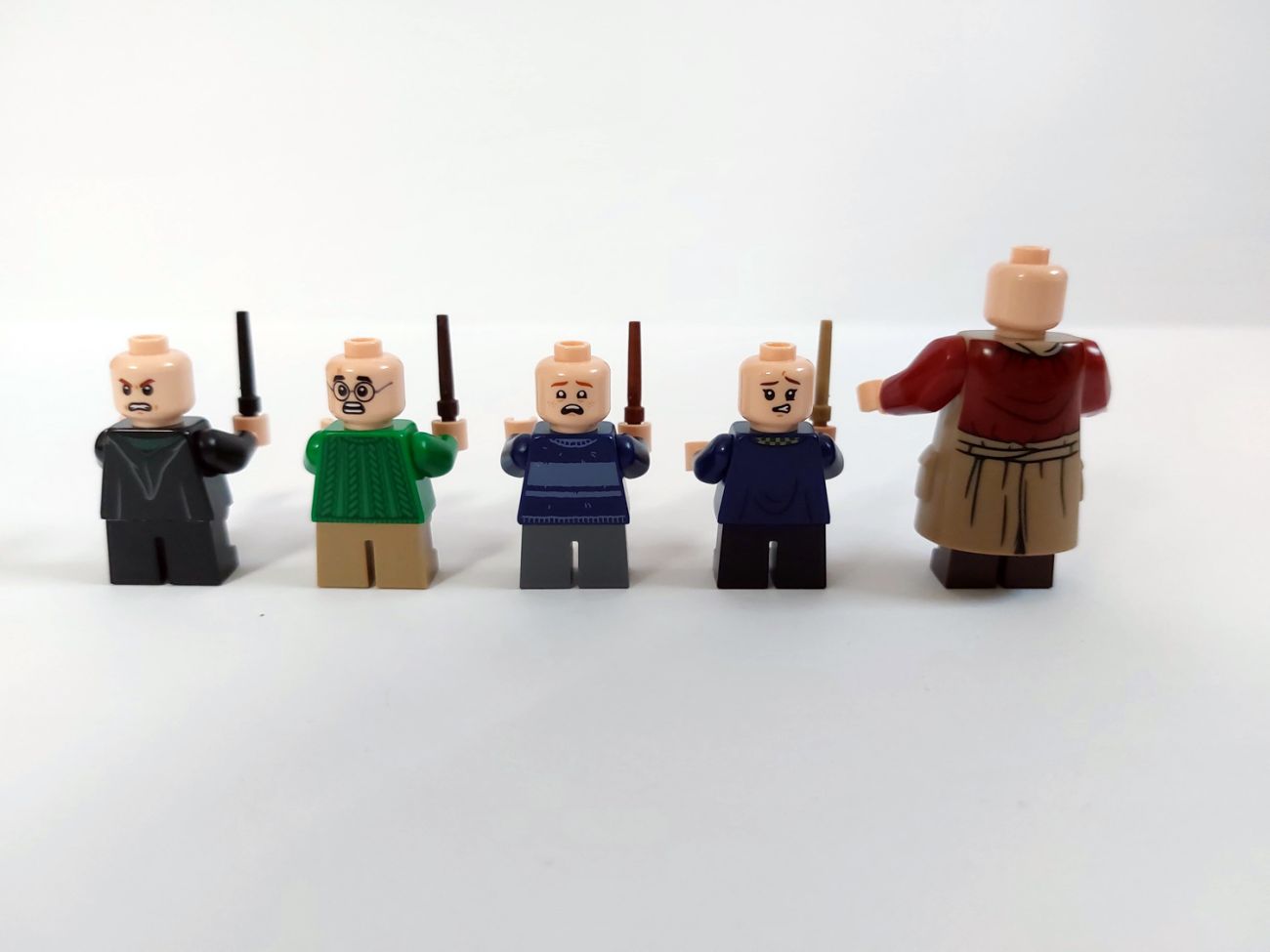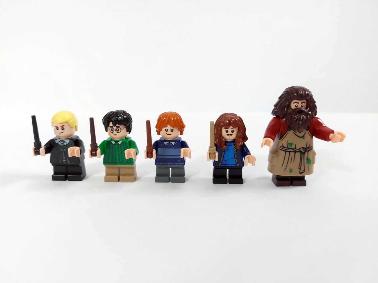 Die Figurenauswahl gefällt mir hier besonders gut. Sie ist sehr akkurat zur dargestellten Szene aus dem ersten Film, als Draco Malfoy durch das Fenster „Norbert den Drachen“ entdeckt. Außerdem sind die Outfits vergleichsweise einzigartig. Die blauen und grünen Pulllover sind neu und stechen deutlich zwischen den üblichen Hogwarts Roben und den anderen Muggel-Outfits heraus. Draco trägt die üblichen Slytherin Roben, Hagrid kommt hier in der dritten Variante seit 2018 mit einer coolen Schürze. Außerdem gibt es erstmals einen Mould für Fang, Hagrids Saurüden, und auch der frischgeschlüpfte Drache Norbert bekommt einen neuen Mould spendiert.