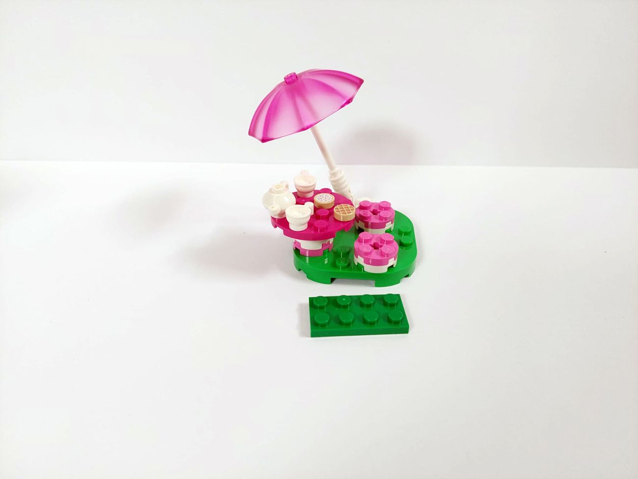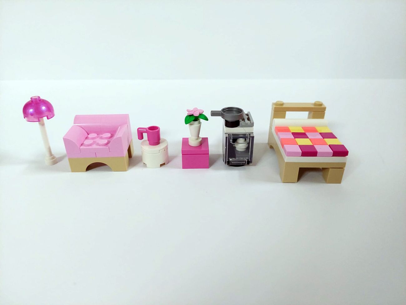 Beginnen wir mit Sophies Haus. Das Haus ist auf einer 8×16 Platte gebaut, an die einige kleinere Platten angebaut werden. An der linken Seite ist eine Laterne, an der rechten eine Blume. Die beiden Fenster sind zweimal dabei, einmal in pink und eckig, passend zur Haustür, und einmal in medium nougat in rund, passend zum Türrahmen. Neben der Tür ist noch ein Briefkasten mit Brief, und im Haus hängt eine bedruckte 2×2 Fliese mit einem Bild darauf.