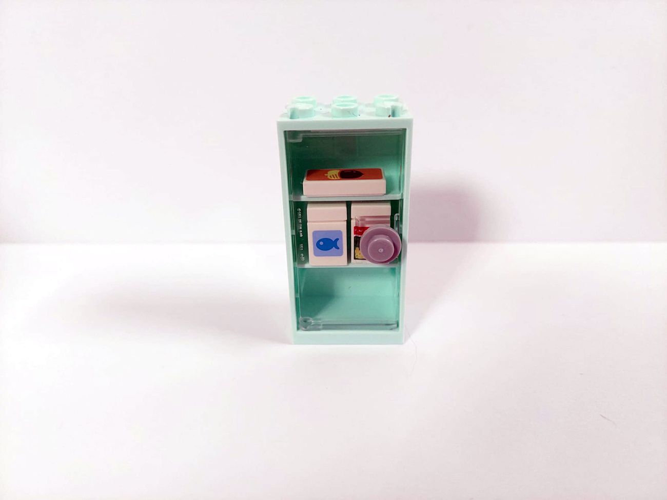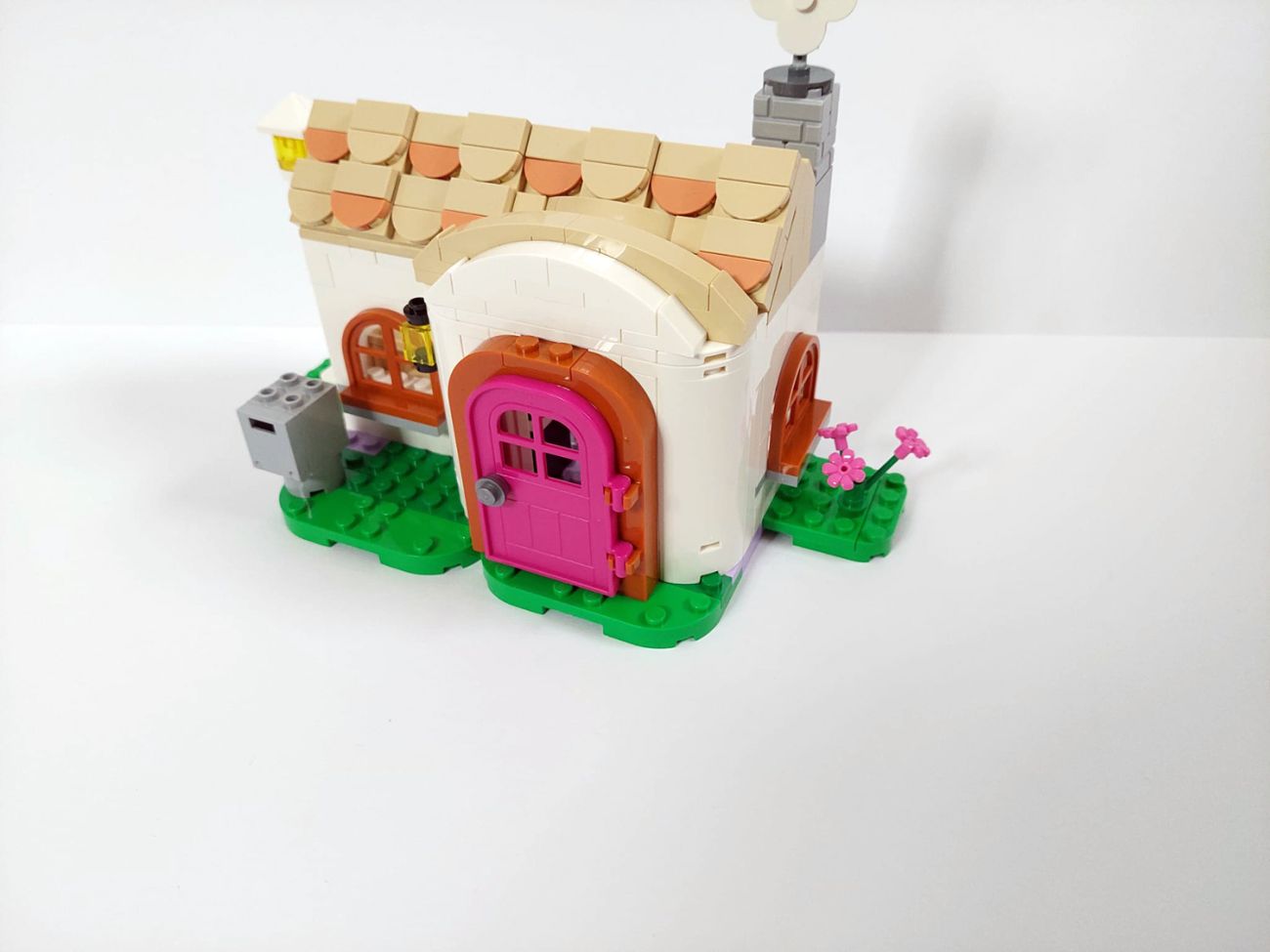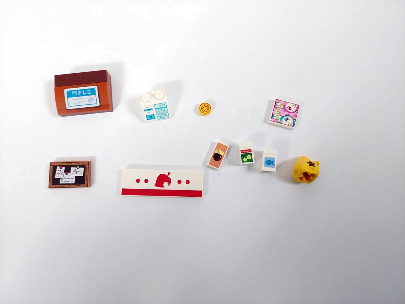 Für den Innenraum hat man insgesamt sechs Möbelstücke, mit denen man dann das Haus einrichten kann, wie man möchte. Einige Ideen dafür gibt es in der Anleitung. Auch Nooks Laden ist auf einer 8×16 Platte mit Erweiterungen gebaut, außen findet man einmal das schwarze Brett aus dem Spiel (dort kann man im Game Aufträge annehmen, Nachrichten lesen usw.) , eine bedruckte 2×3 Fliese, sowie die Verkaufsbox, in die man Gegenstände zum Verkauf legen kann, als ein bedruckter 2×4 curved slope. Die Kiste lässt sich öffnen und darin befindet sich eine Karotte. Neben dem Laden steht noch eine Gießkanne und eine Blume. Auch das Logo auf dem Dach ist eine bedruckte Fliese. Im inneren findet man einen Eimer und eine Gitarre im Schaufenster, sowie eine Blume und ein Radio zum Verkauf. Im Eck steht ein Eimer mit Gegenständen und ein Schrank mit Fischfutter, Blumensamen und einer Bastelkarte. Außerdem sind einige Verbindungsstücke dabei, mit denen man die Gebäude verbinden kann. Auf einem ist ein Orangenbaum, den man öffnen kann, um einen Ast zu erhalten, auf dem anderen ist ein Kaffeekranztisch mit einem Sonnenschirm. Die Häuser sind im Vergleich zum Spiel sehr akkurat umgesetzt.