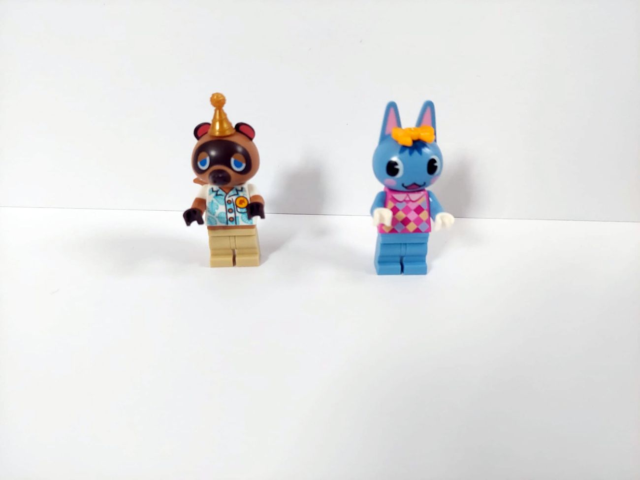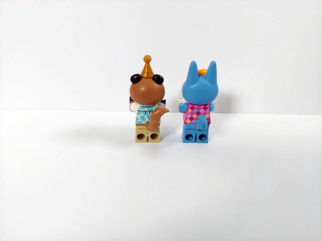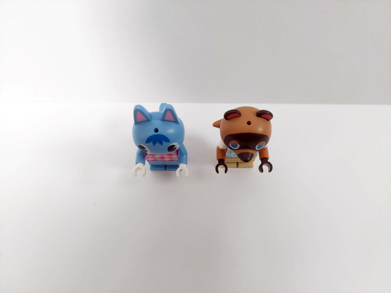 In diesem Set sind Tom Nook und Sophie enthalten. Sie sind beide exklusiv in diesem Set (aktuell gibt es keine der Figuren der ersten Welle „doppelt“) und haben neue Headmolds, neue Torsos und mittelgroße Beine bekommen. Nooks Arme sind duo-molded und Sophies Beine sind neu im Farbton Medium Blue. An den Köpfen der Figuren kann man beliebige Accessoires anbringen, dabei sind ein Partyhut für Tom Nook und eine Schleife für Sophie. Ich habe die beiden Figuren auch anderen Animal Crossing Fans, die nicht im LEGO-Thema sind, gezeigt, und sie kamen sehr gut an, ganz besonders Tom Nook.