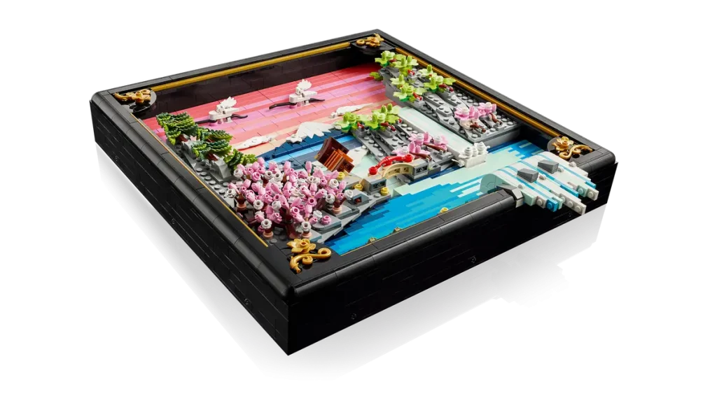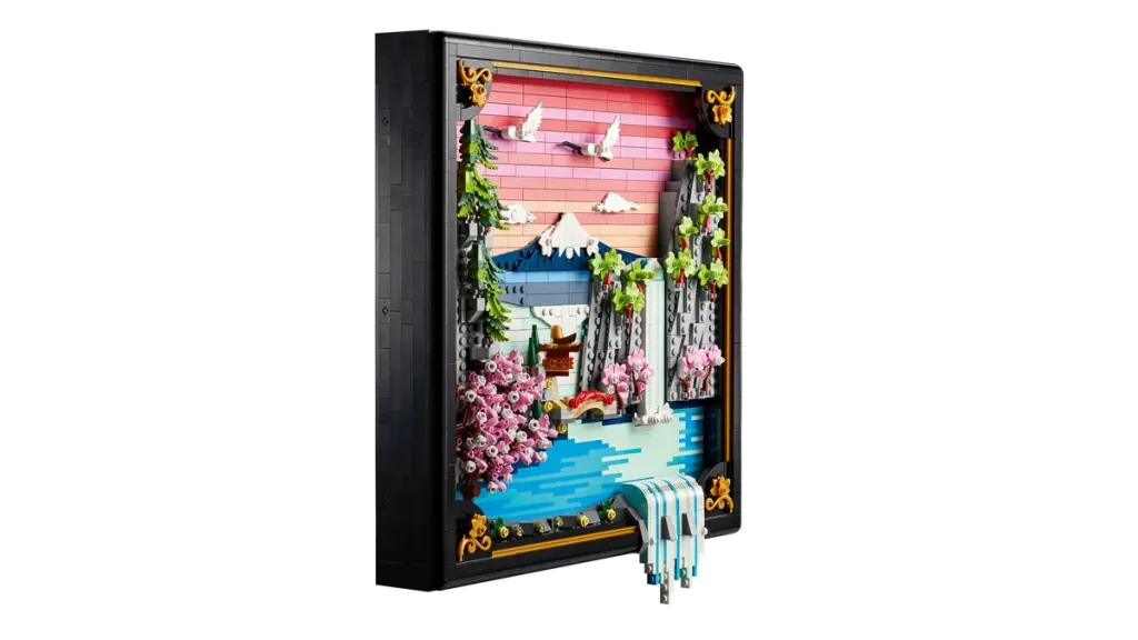 Das Bild wartet mit zahlreichen Details der japanischen Kultur auf wie beispielsweise dem berühmten Mount Fuji, vielen Mandschurenkranichen, einem Teehaus, einem Wasserfall aber auch dem „Sango kaku“-Ahorn. Natürlich dürfen auch zahlreiche markante Kirschblüten im Gesamtbild hier nicht fehlen. Der Wasserfall im unteren Bereich ergießt sich als besonderen Effekt über den Rahmen heraus. Der schwarze Rahmen wird von einigen Verzierungen in Gold garniert. Das Modell besteht aus 1.892 Teilen und ist 39 cm hoch, 35 cm breit und 6 cm tief. Alle Bilder und Infos zum Set findet ihr im Beitrag.
