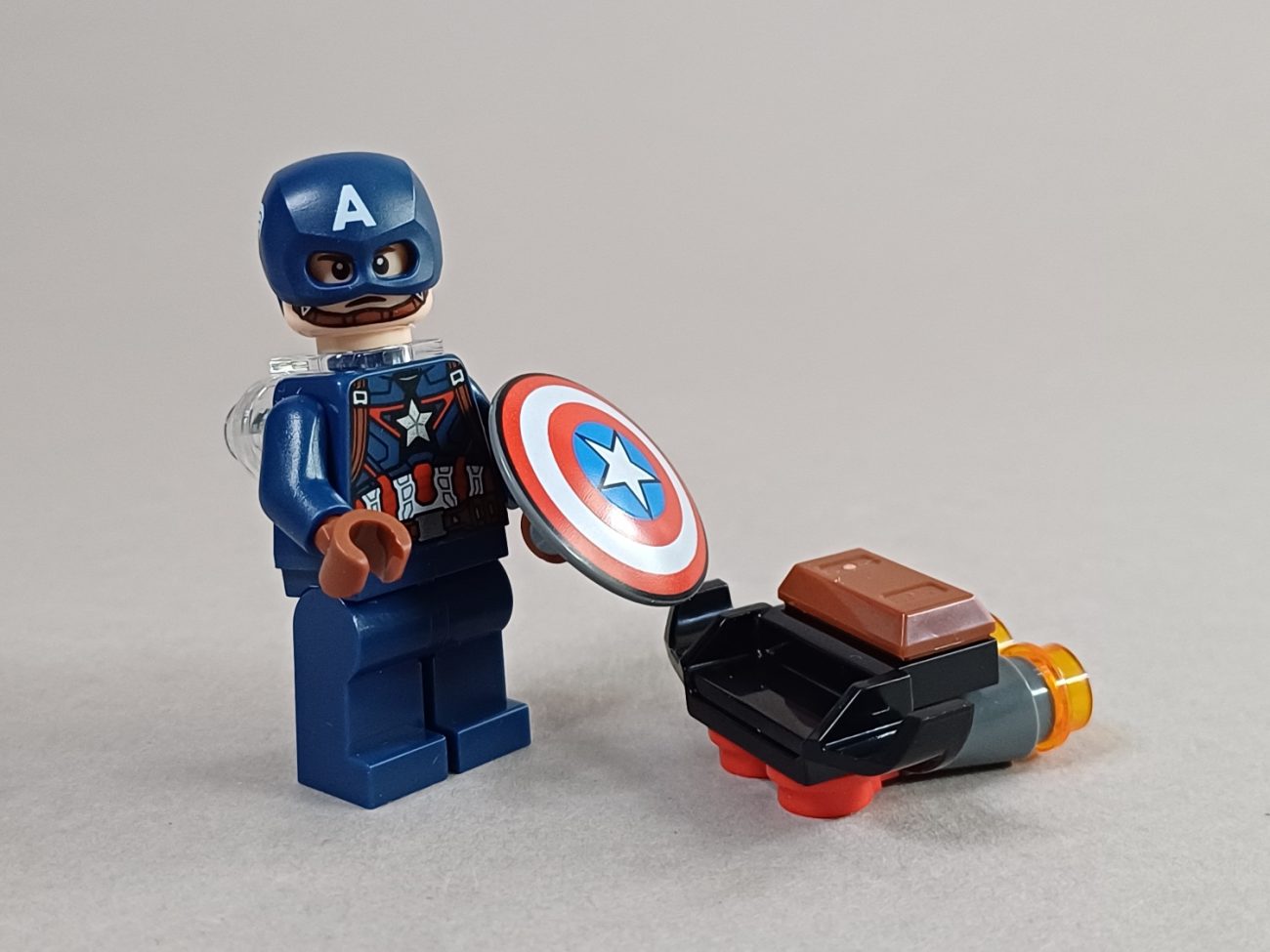 Die Figur ist schnell zusammengebaut und auch sein Jet-Pack ist nichts wirklich Besonderes. Zuerst dachte ich, es handelt sich bei der Figur um den exklusiven Captain sh0973 aus dem Age of Ultron 76291 Set, jedoch ist mir nicht aufgefallen, dass diese Figur nur eine Variante mit „Neck Bracket“ ist und es diese Figur sh0736 ohne dieses Teil in fünf weiteren Sets seit 2021 gibt. Dementsprechend günstig ist die Figur auf Bricklink und schon für unter drei Euro auf Bricklink erhältlich.