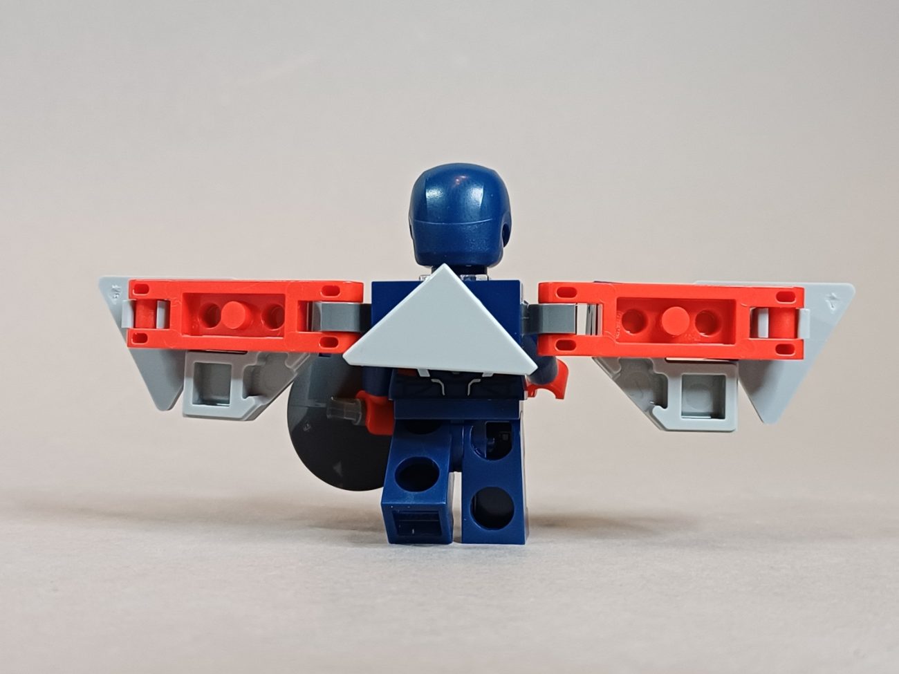 Die Captain America Minifigur in diesem dunklen Blau finde ich eigentlich ganz cool, jedoch stört es mich sehr, dass es eine sehr inakkurate Version im Vergleich zu den Sets ist. Ihn gab es in nur einem einzigen Set, dem Captain America vs. Red Hulk Battle (76292), jedoch haben seine Flügel dort mehrere Sticker, sind komplett anders gebaut und auch die Hose ist eine andere. Ohne Sticker kostet die Figur (sh1003) auf Bricklink ca. Sechs Euro, mit Stickern gibt es die Figur (sh1003s) ab ca. Acht Euro.