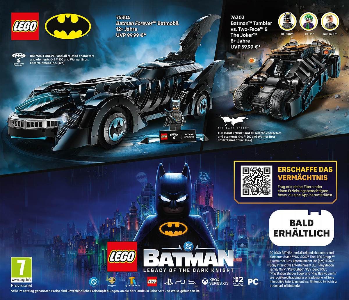 Seit Anfang März 2026 sind auch einige LEGO Batman Set-Neuheiten erhältlich, die nicht nur für Minifiguren-Sammler interessant sein dürften, sondern auch für die Gamer unter euch. Käufer der Jubiläums-Sets können im bald erscheinenden LEGO Batman Legacy of the Dark Knight Videospiel nämlich digitale Extras in Form einer goldenen Batman-Spielfigur oder eines goldenen Batmobils freischalten. Damit macht das Gameplay sicherlich noch mehr Spaß ;-)