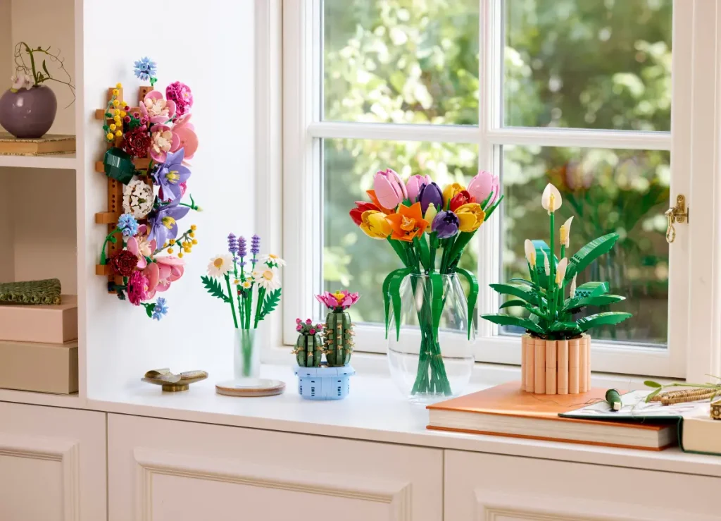 Sehr interessant wird es auf den Lifestyle-Bildern des Sets denn dort hat LEGO mindestens drei weitere kommende Neuheiten aus der Botanicals Themenwelt versteckt, unter anderem sehen wir dort einen Lavendel samt Gänseblümchen, ein Kakteen-Paar im Topf, eine Friedenslilie und ein etwas größeres Gesteck aus verschiedenen Blumen als Wandschmuck.