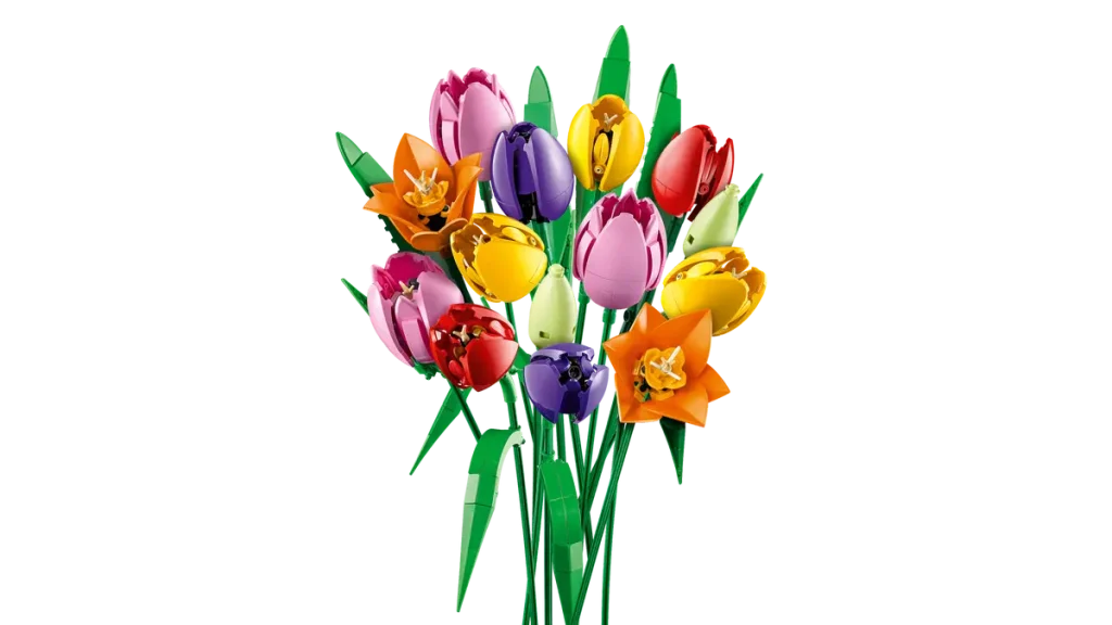Der bunte Strauß besteht aus insgesamt vierzehn baubaren Blumen in 5 verschiedenen Sorten, darunter befinden sich zahlreiche Teile in neuer Farbgebung und auch ein paar komplett neue Elemente bei den 576 Teilen. Die Stängel sind dabei wie gewohnt auch in der Länge anpassbar, die Blüten und Knospen sind auch unterschiedlich weit geöffnet um verschiedene Stadien anzuzeigen.