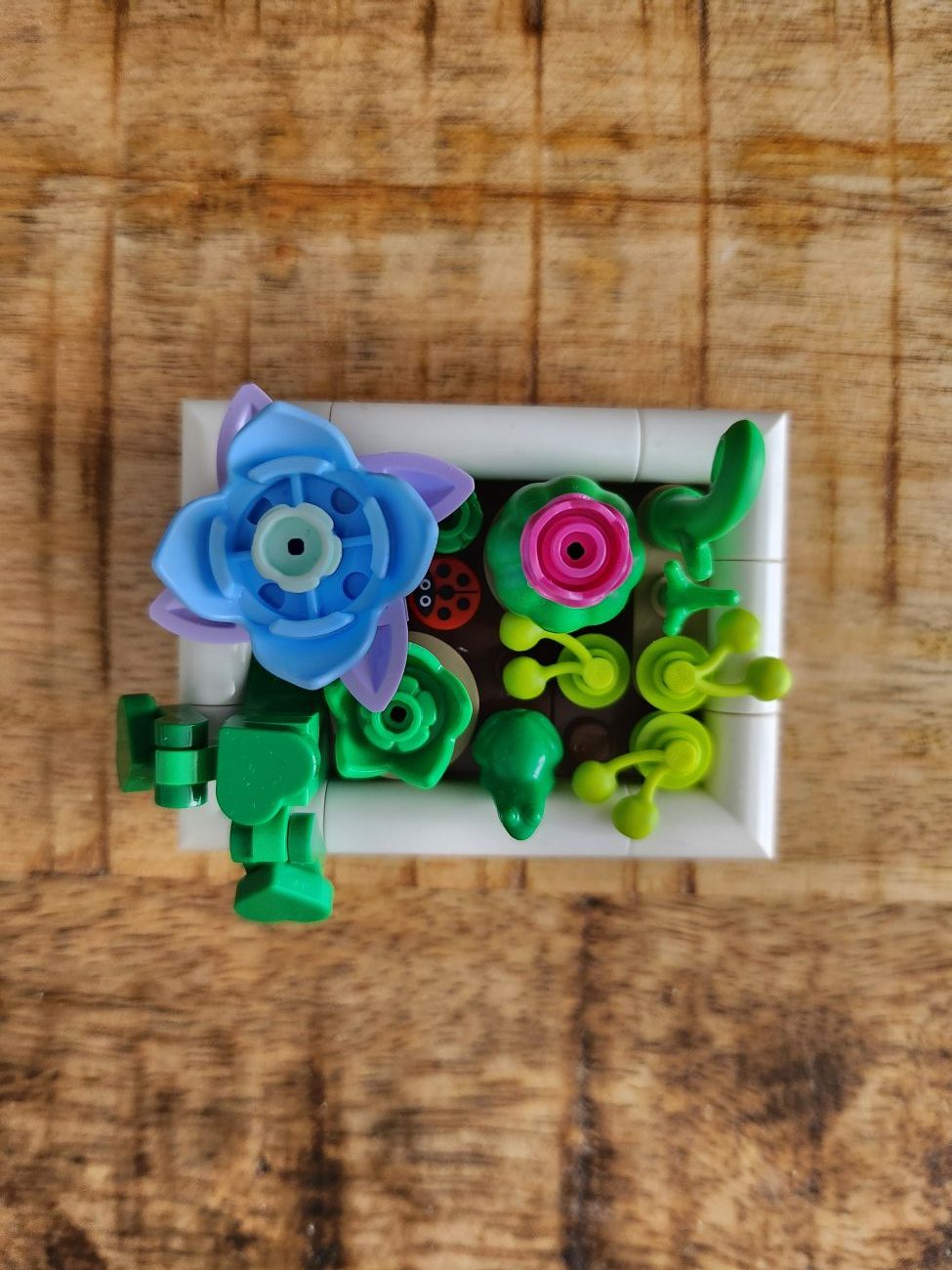 Innerhalb von wenigen Minuten ist das Set dann auch schon zusammengebaut. Für den Aufbau kommen ausschließlich bekannte Pflanzenteile zum Einsatz. Die Blütenteile in Blau/Violett stellen beispielsweise eine sogenannte „Purple Pearl“ dar, die grünen Kirschen wurden zur Umsetzung von Erbsenpflanzen verwendet. Auch eine kleine rote bedruckte Marienkäfer-Fliese hat es in unseren kleinen Garten geschafft.