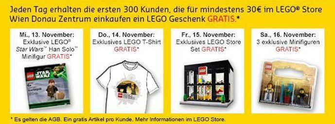 Vom 13. bis 16. November 2013 feiert der neue LEGO® Brand Store im Donau-Zentrum Wien (der zweite Store in Österreich übrigens) seine offizielle Eröffnung. An jedem dieser Tage warten auf die 300 ersten Kunden, die für mindestens 30 Euro LEGO® kaufen, ein Geschenk gratis dazu. Neben der Star Wars™ Han Solo™ Minifigur und einem exklusiven T-Shirt gibt es unter anderem das ziemlich coole LEGO® Store-Set sowie drei besondere Minifiguren – ebenfalls im Set.