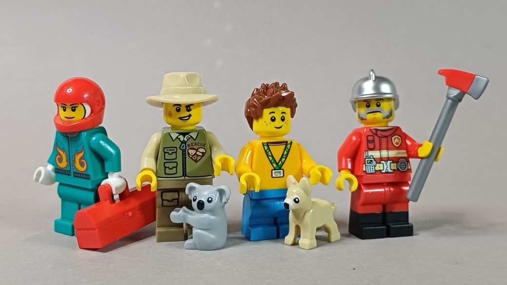 Unter den vier Figuren haben wir eine Rennfahrerin, welche unter anderem einen komplett neuen und exklusiven Kopf erhalten hat. Dieser lässt sich sicherlich auch gut für Astronauten oder Taucher verwenden, um die Minifiguren noch detaillierter darzustellen. Außerdem gibt es noch einen Ranger mit einem coolen Hut, einem komplett neuen Torso und dem Koala, welchen wir erstmals im Jahr 2023 in der Sammelfigurenserie 24 erhalten haben.