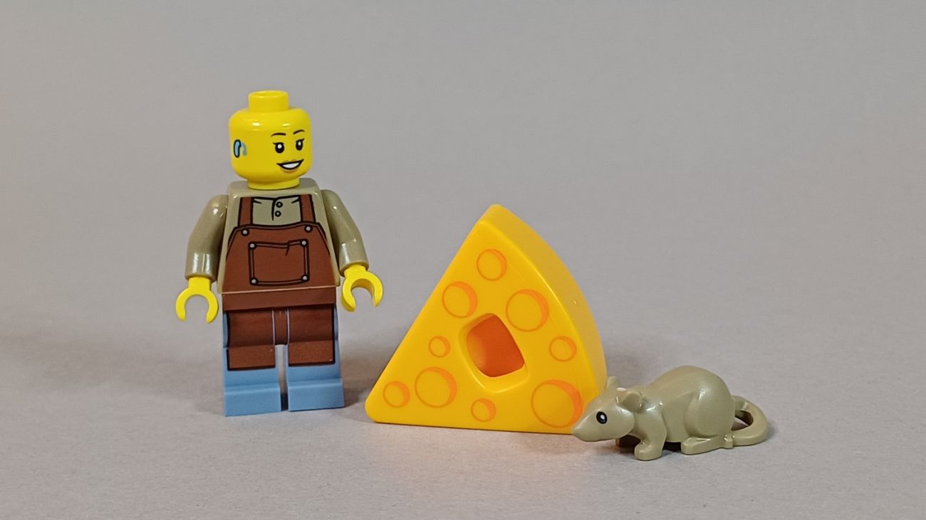 Und als Letztes haben wir noch eine Frau mit Käse Kostüm und eine Ratte. Die beiden passen natürlich perfekt zusammen und ich bin gespann,t wie oft LEGO dieses dreieckige Kostüm noch verwenden kann. Wir hatten bereits eine Melone, Pizza und zwei Kuchen. Vielleicht kommt ja als Nächstes eine Waffel?