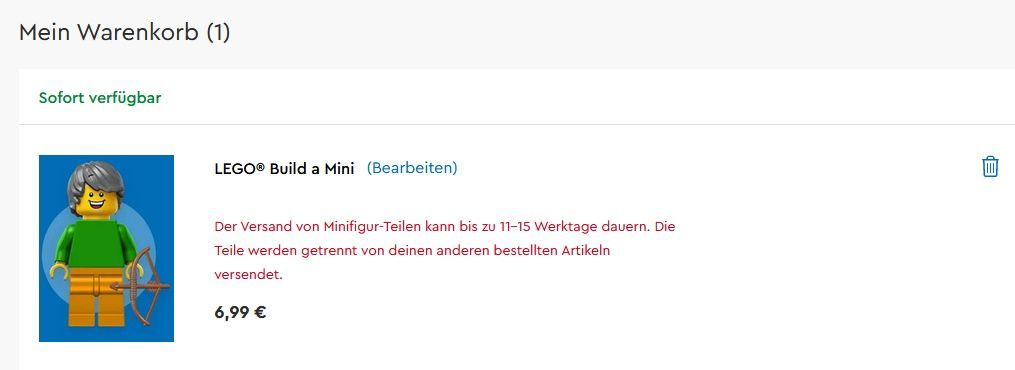 Wenn ihr eure Figuren zusammengebaut habt, könnt ihr sie in den Warenkorb legen. Die Figuren werden getrennt verschickt, LEGO gibt aktuell eine Lieferzeit von 11 bis 15 Tagen an.