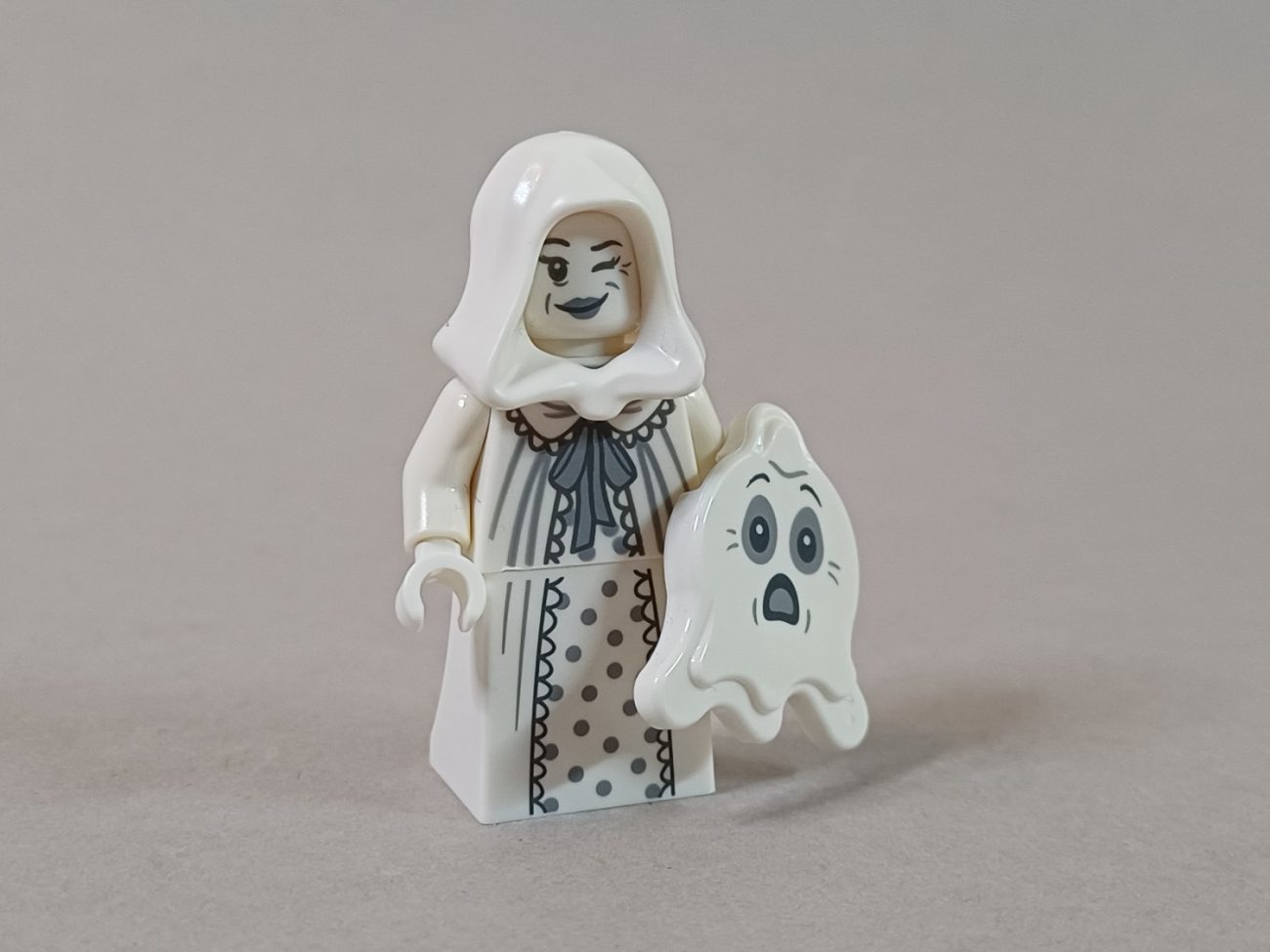 Der weiße Geist gefällt mir ebenfalls sehr. Das Kleid könnte man auch super als Abendkleid verwenden für andere Themenwelten und mit dem zweiten Geist auf der Fliese könnte man den selbstgebauten Gruselwald oder das Geisterhaus schmücken. Alle Minifiguren haben auch die Rückseite des Kopfes bedruckt, was wir bei der letzten Welle leider nicht hatten.