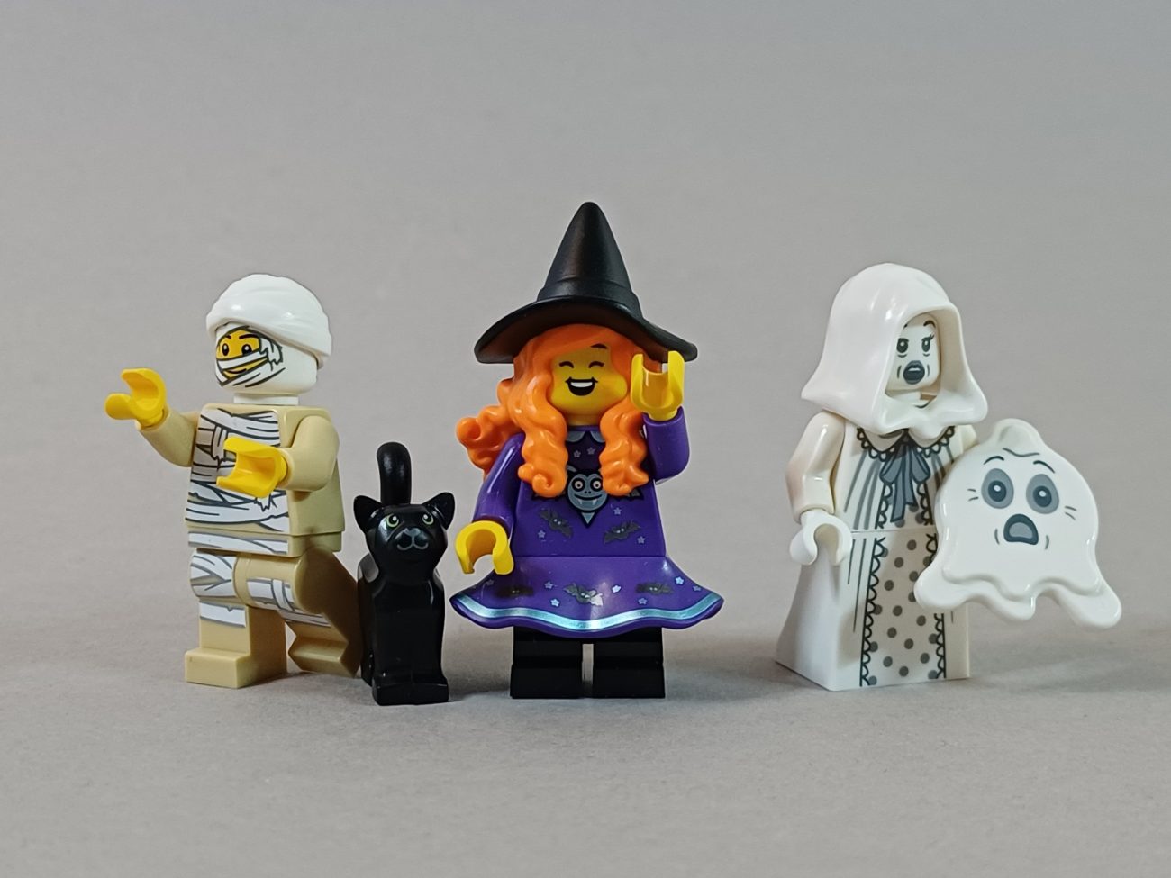 Auch die Mumie ist super gelungen. Der Kopfverband passt perfekt dazu und auch die weißen Bänder auf den Elementen in Tan sehen sehr gut aus. Jedoch gibt es hier etwas, was mich stört, und zwar sind die Bedruckungen leider nur auf der Vorder- und Rückseite. Die Figur sieht von der Seite einfach seltsam aus, weil die Bänder genau an der Kante aufhören. Die schwarze Katze als Accessoire passt ebenfalls super zu Halloween.