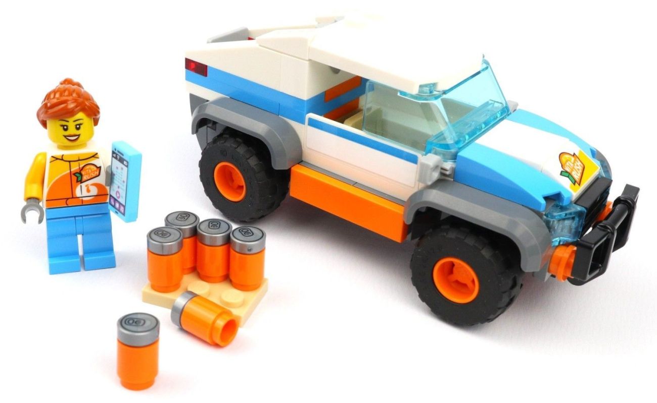 Die ersten LEGO-Steine und die erste Bauanleitung ergeben ein Fahrzeug. Das Auto ist ein kleiner Geländewagen mit Bullenfänger an der Front. Dazu ist auf der Motorhaube die Werbung für das neuste „Hip-Getränk“ aus LEGO City abgebildet – ViTA-Rush. Und ja, hier ist es kein Aufkleber.
