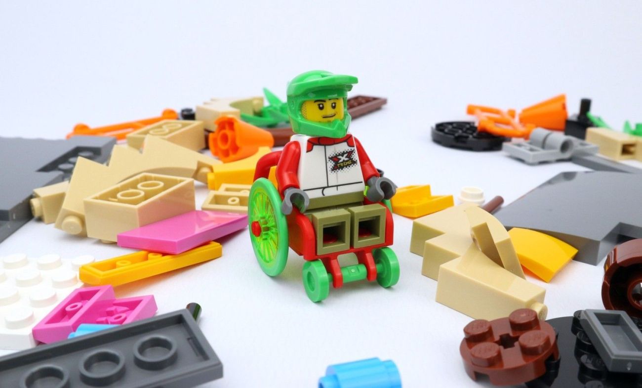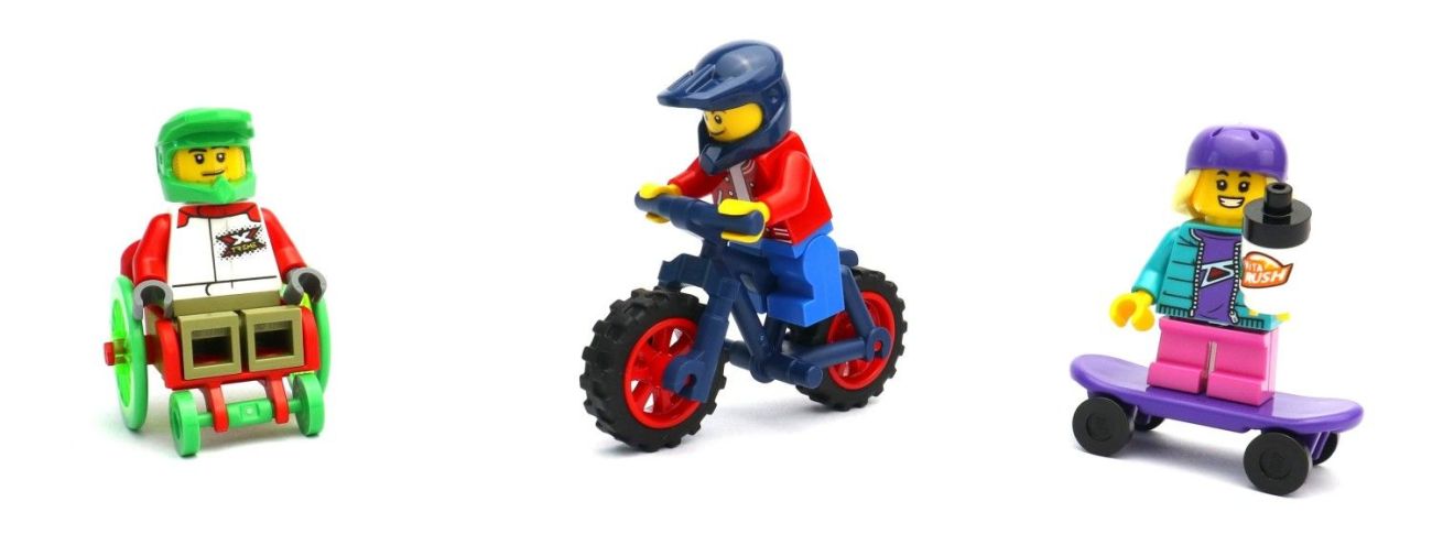 Egal ob mit Rollstuhl, Mountainbike oder dem Skateboard, alle drei sind etwas Besonderes. Den Helm in Dark Blue kennt man so ja bereits, aber das passende Bike in der Farbe ist erst in diesem Jahr neu. Der Rollstuhl in Rot sowie die Räder in Grün und der passende Helm gab es vorher auch noch nicht in dieser Farbe. Bei der jungen Skaterin fällt sofort die neue Kopfbedeckung auf, die blonden langen Haare und der Lila-Helm (ein Element) waren so noch nie in einem LEGO Set enthalten.