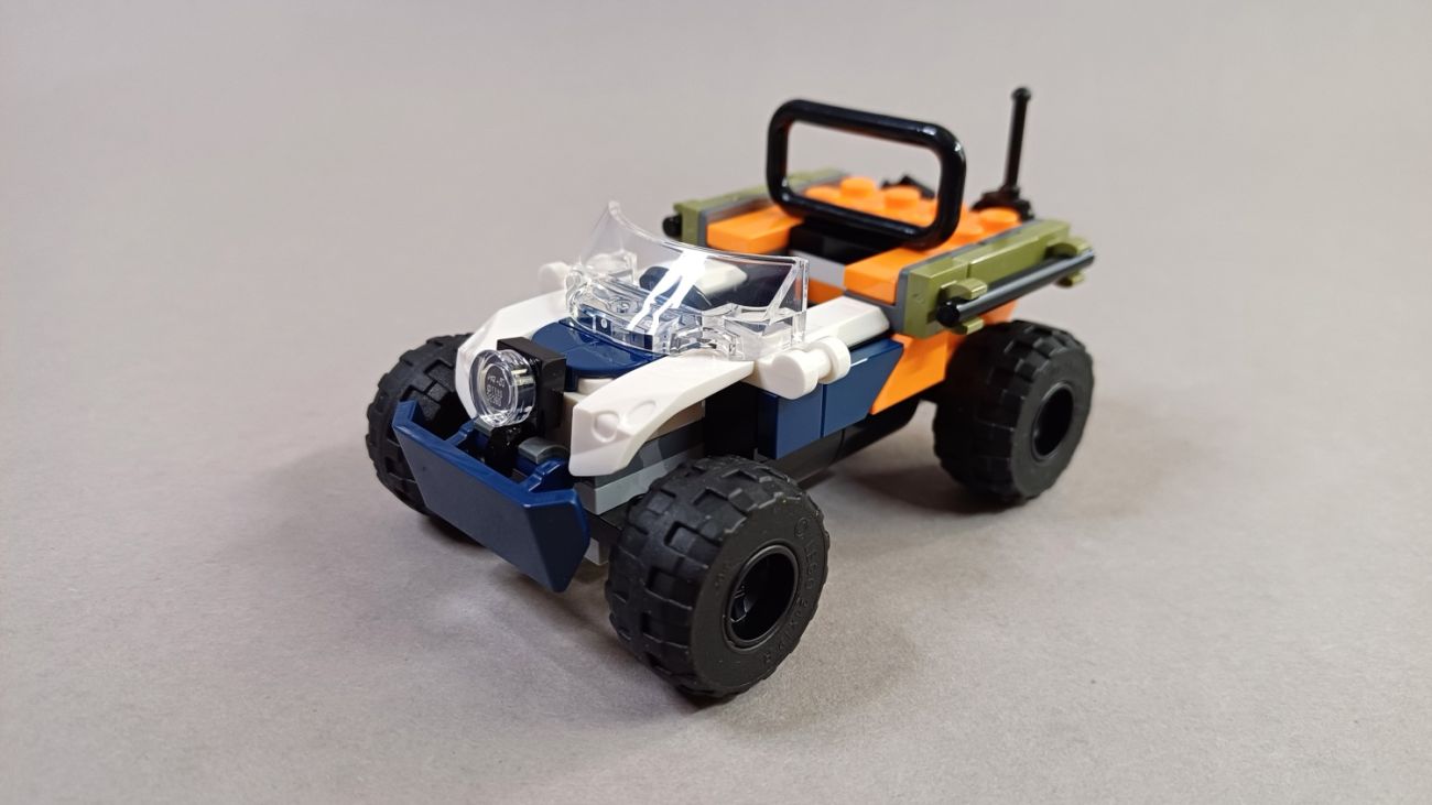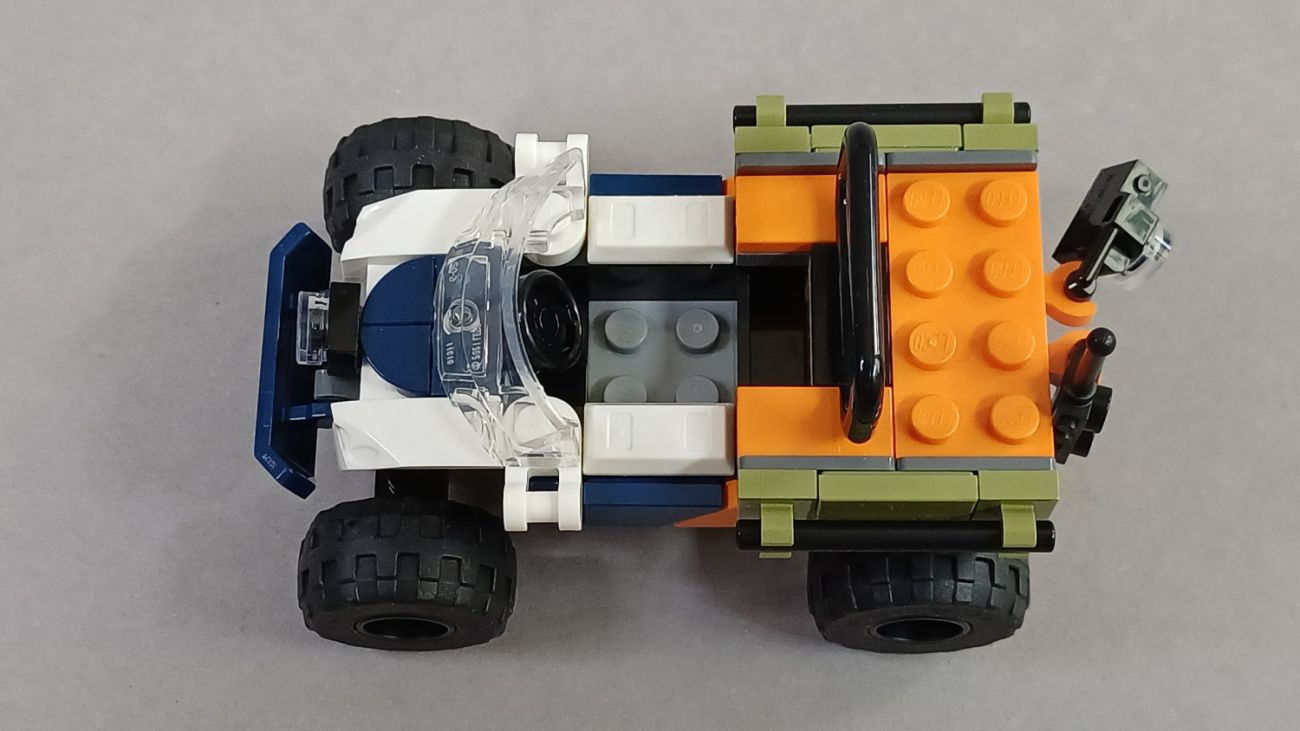 Das kleine Quad ist 9 cm lang und ca. 6 cm breit. Die Farbkombination ist sehr interessant mit dem Weiß, Dunkelblau und Orange, welches einen olivgrünen Streifen hat. Die Bautechniken an dem Fahrzeug sind recht simpel, ich finde es nur etwas schade, dass hinten ein so großer Klotz ist, welcher keinerlei Verwendung hat. Theoretisch könnte man eine Minifigur draufsetzen, aber eine Kiste wäre da schon cooler gewesen. Dort hätte man dann auch die Accessoires verstauen können.