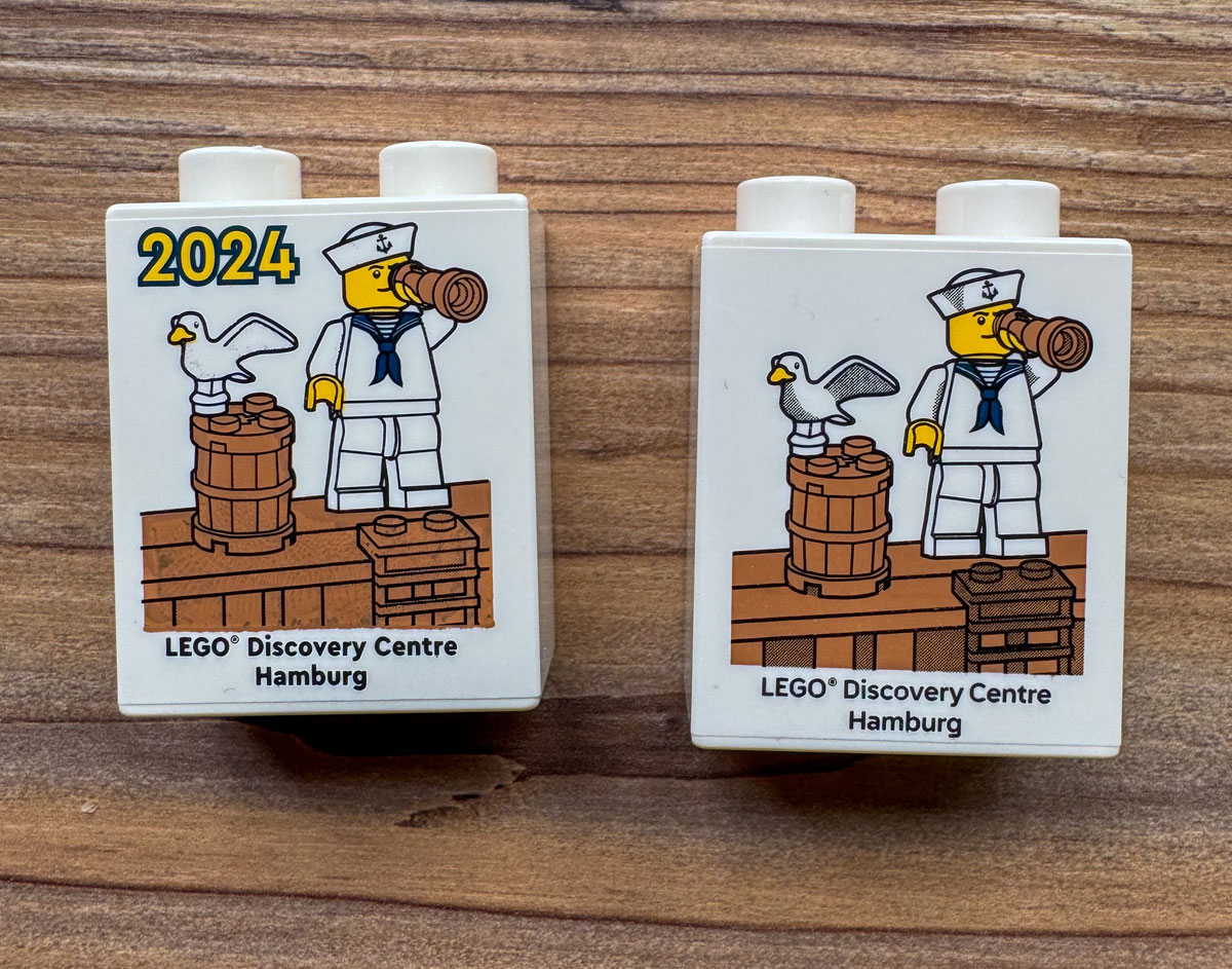 Beide DUPLO-Sammelsteine zeigen das gleiche Motiv, passend zur neuen Location direkt am Wasser. Der Stein mit dem Aufdruck „2024“ stammt aus vergangenen Jahr, als das LEGO Discovery Centre Hamburg ursprünglich öffnen sollte. Wie es aussieht, waren die Steine da schon produziert und lagen seitdem in verstaubten Kartons. Der „neue“ Stein trägt keine Jahreszahl.