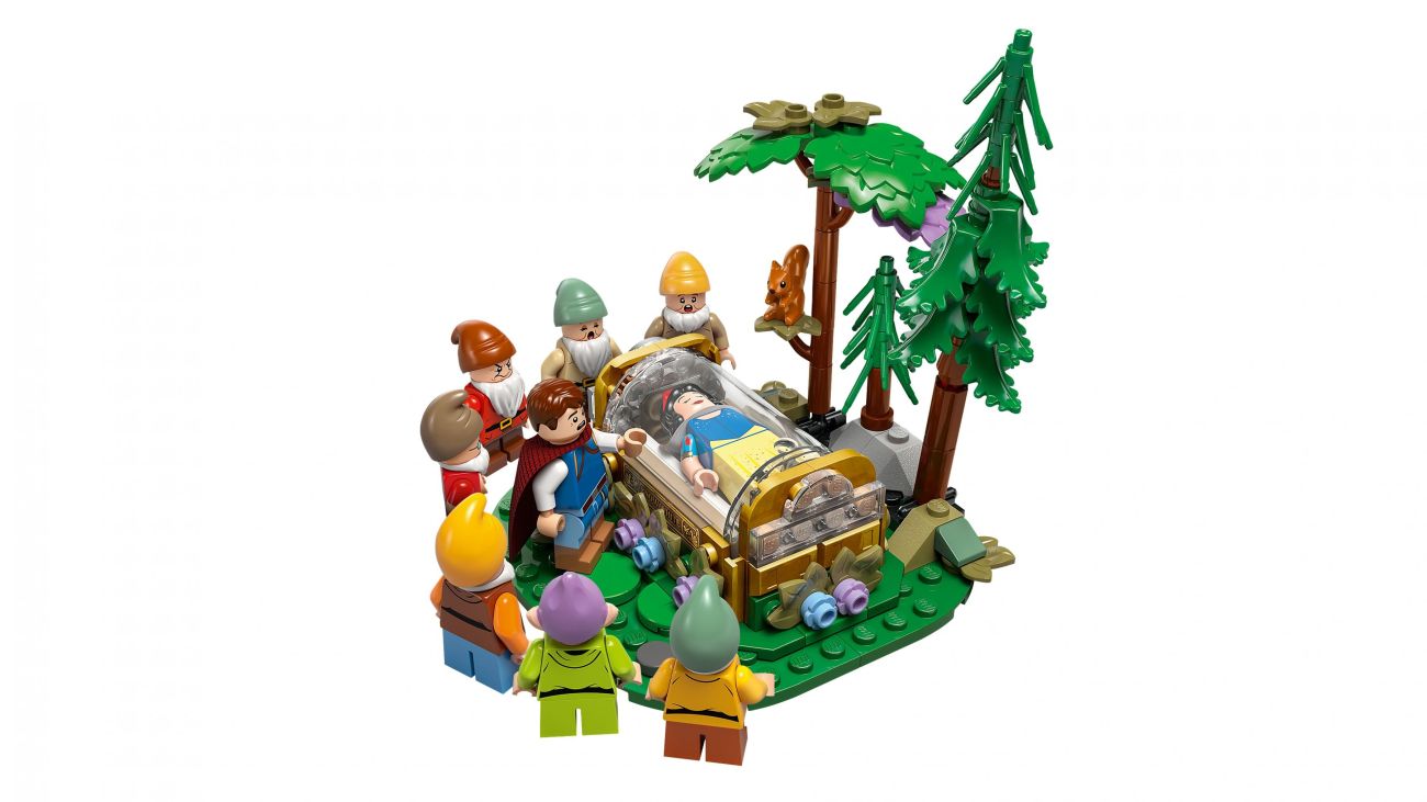 • Legendäre Filmfiguren: Schneewittchen, die Maskierte böse Königin, der Prinz, Chef, Seppl, Pimpel, Brummbär, Happy, Schlafmütz und Hatschi sowie 6 LEGO® ǀ Disney Tiere