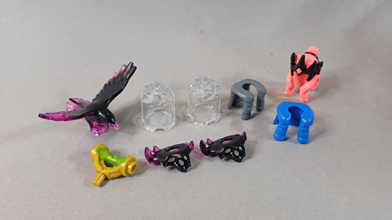 Mit den neuen Elementen geht es auch direkt weiter: es gibt einen neuen Raben und gleich vier Kristallkuppeln. Es gibt eine neue Rüstung in schwarz-pink und bei Matteo und Madteo sogar eine Weste, welche auch gleich in zwei Farben kommt. Außerdem hat Matteo eine neue Sanduhr mit mehreren Studs und Bars zum Anbauen.