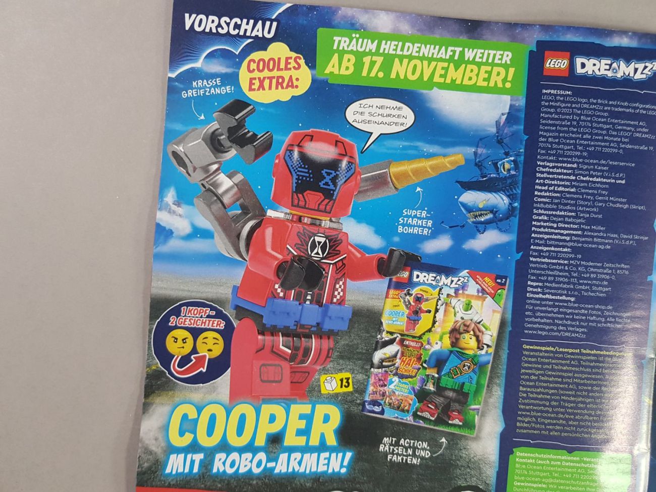 Das LEGO Dreamzzz Magazin wird es nun alle zwei Monate geben. Die nächste Ausgabe erscheint dann am 17. November und wird mit einer Minifigur von Cooper mit zwei Robo-Armen fortgeführt. Dieser Cooper ist bis jetzt nur in dem 71458 Krokodilauto und dem 71459 Stall der Traumwesen verfügbar. Da diese Sets nicht gerade günstig sind, ist das Heft eine gute Alternative um diese Figur zu bekommen. Ich hätte es aber auch sehr cool gefunden, wenn dort, ähnlich wie der kleine Z-Blob aus dem ersten Heft, ein kleines blaues Krokodil dabei wäre oder ein kleines Auto.