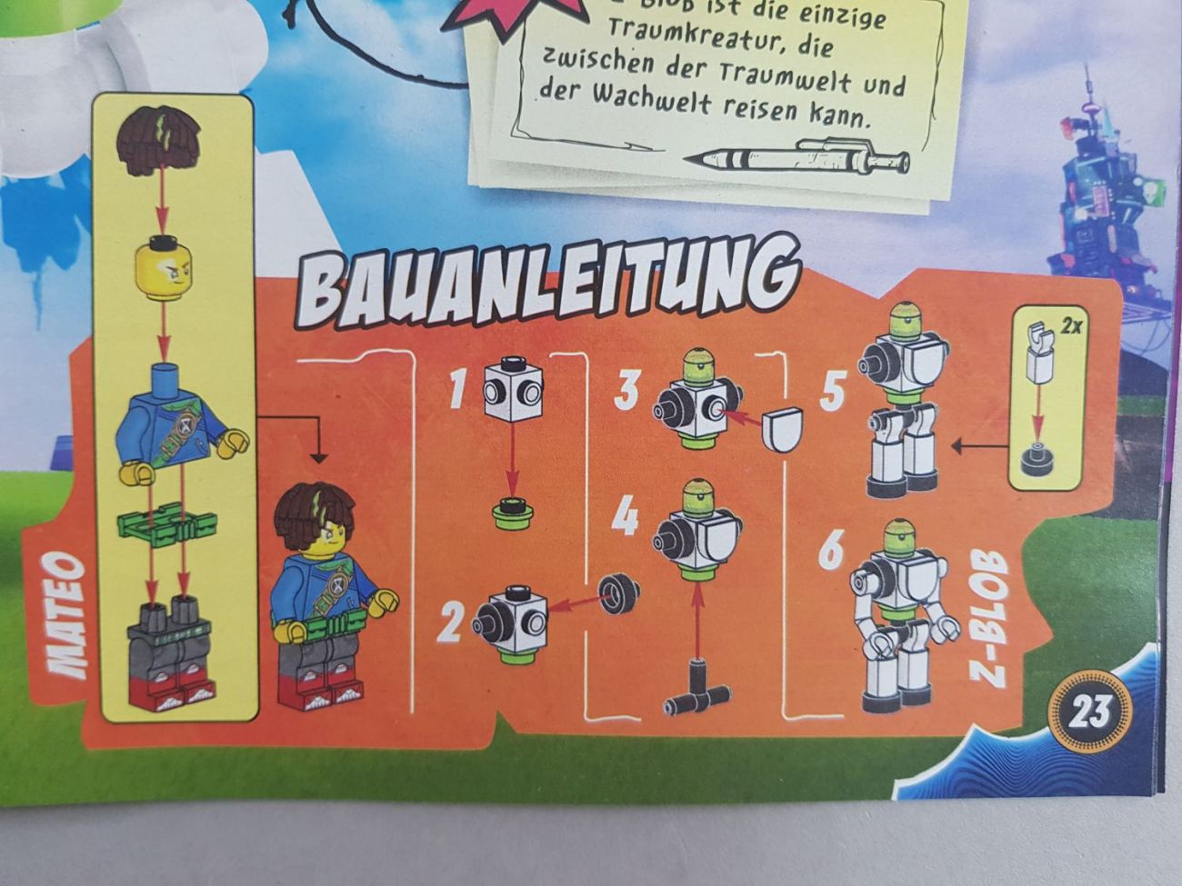 Die Minifigur und Z-Blob werden hier aus insgesamt 18 LEGO Teilen gebaut. Diese kleine Version von Z-Blobs Roboter gefällt mir sehr, den bedruckten Kopf gibt es sogar nur im 71469 Albtraum Haischiff. Allerdings fiel mir hier ein kleiner Fehler auf, und zwar ist die Stange, mit der man den Körper und die Beine kombinieren kann, hier in Schwarz beigegeben, während sie sonst überall in Weiß gezeigt wurde. Ist das nur bei meinem Heft so oder war das bei euch auch? In Schwarz gefällt mir das Teil allerdings deutlich besser, da der Roboter sonst zu weiß wäre und es auch besser zum Set passt.