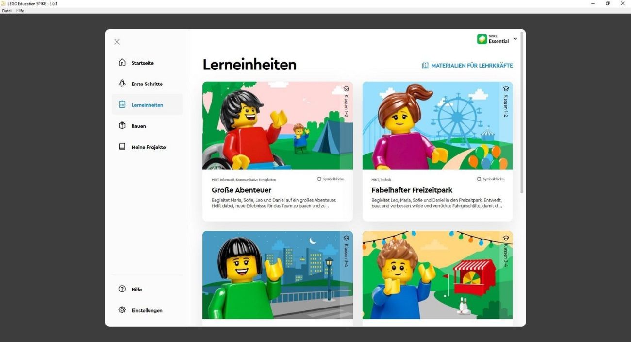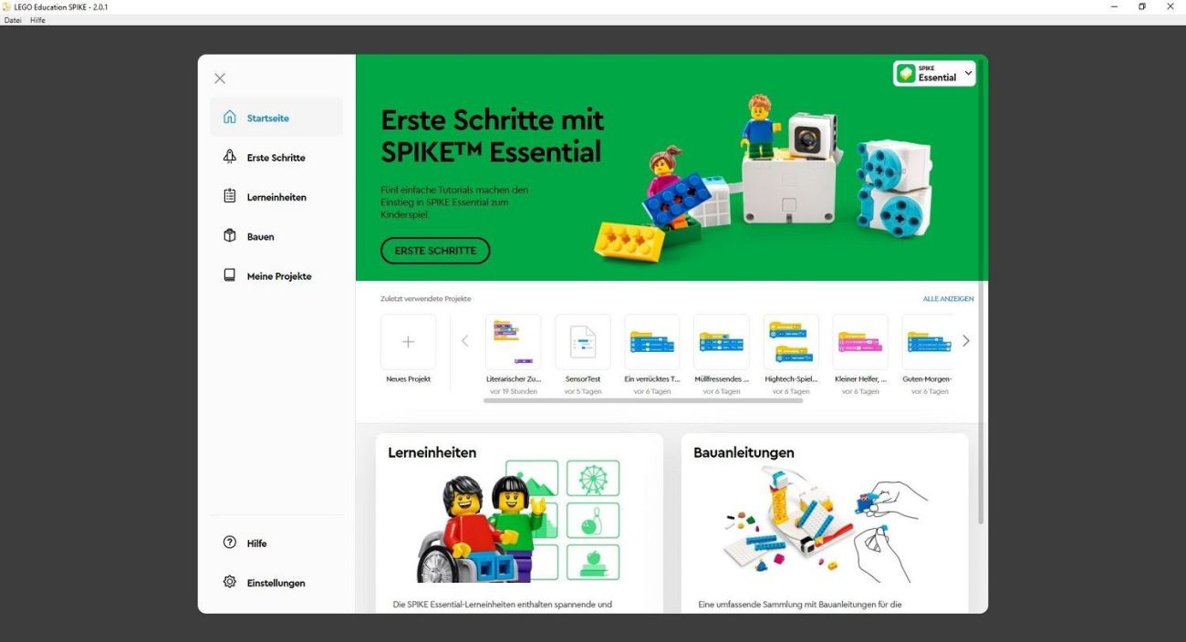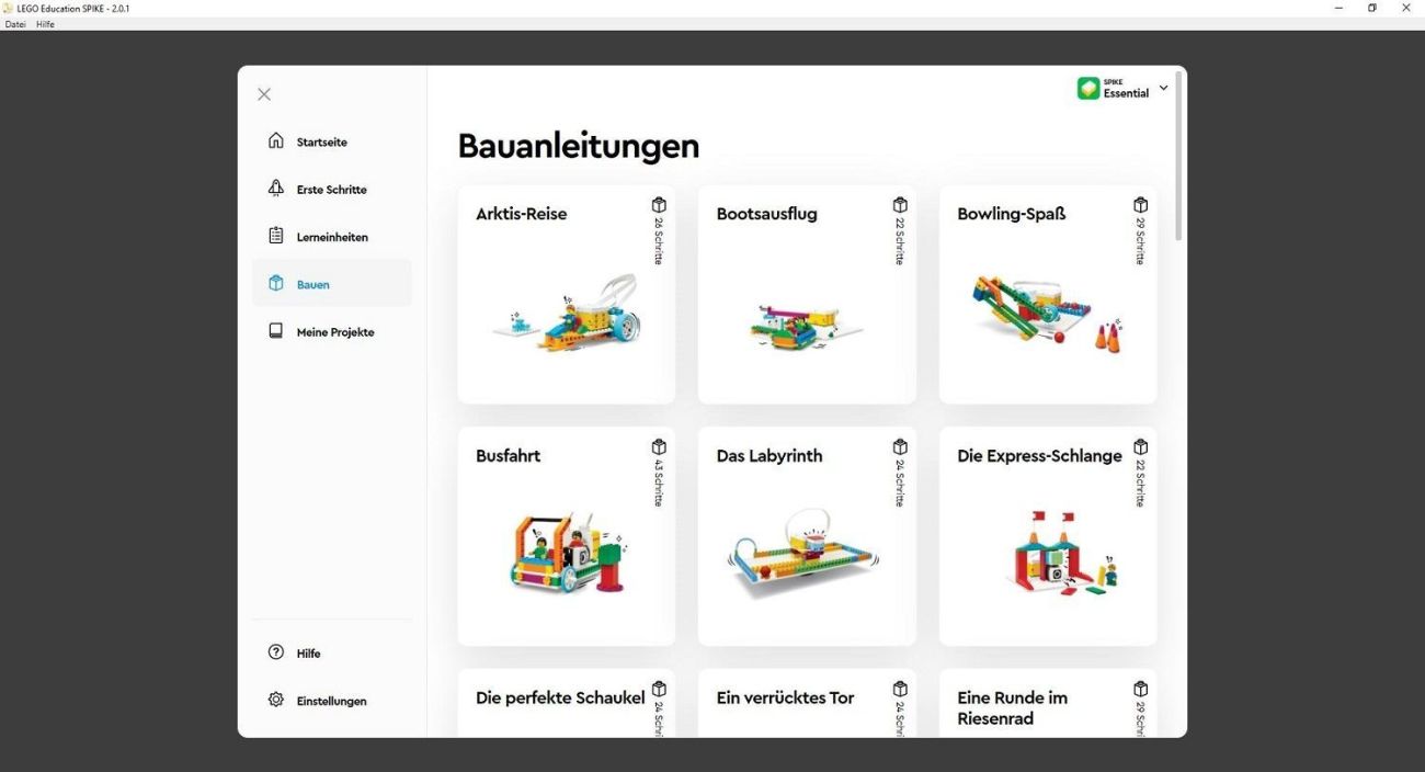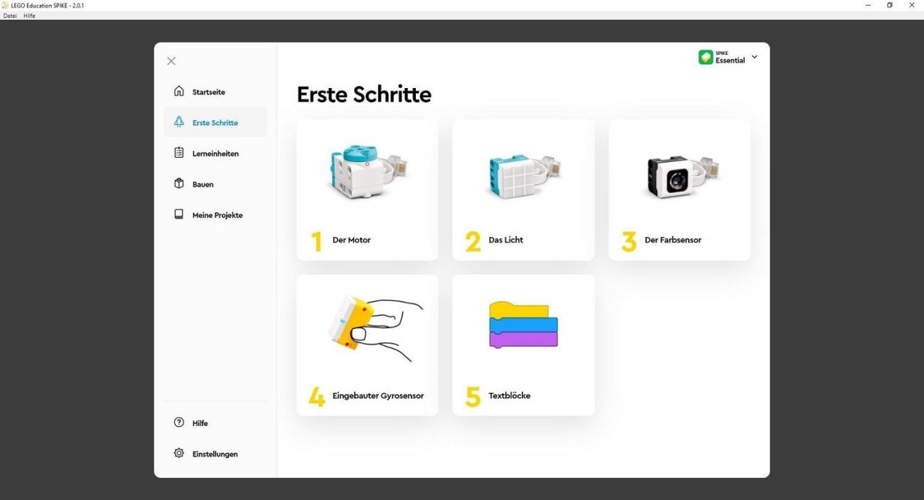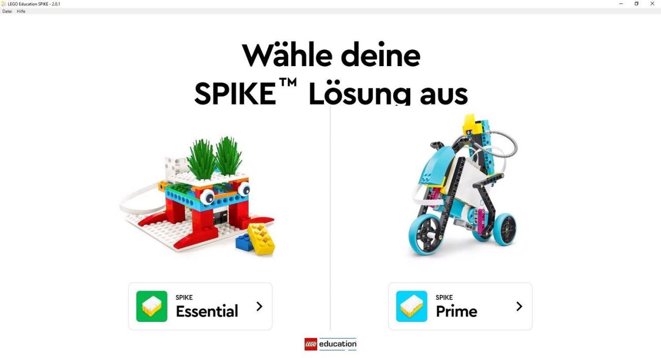 Beim Starten der App wird abgefragt, welches SPIKE-Set genutzt wird: SPIKE Essential oder SPIKE Prime. Wählt man ein Set aus, wird das Hauptmenü angezeigt.