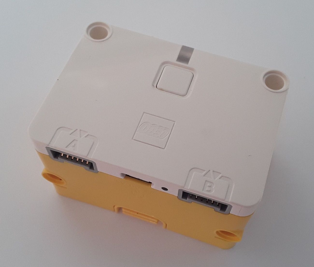 Das Herzstück des SPIKE Essential Sets ist der neue kleine Technic Hub in Gelb, der fast wie eine Miniversion von dem großen Technic Hub aus SPIKE Prime aussieht. Er hat neben einer Taste und einer mehrfarbigen LED zwei Powered Up Anschlüsse und einen Akku. Die Laufzeit des Akkus beträgt im Dauerbetrieb mit einem Motor ganz grob 3 Stunden und ist damit vergleichbar zu dem WeDo 2.0 Akku. Im Gegensatz zu dem Vorgänger, lässt sich der SPIKE Essential Hub nicht mit Batterien betreiben. Entsprechend der Akkulaufzeit eignet sich der Hub für ein bis zwei Schulstunden; ein Projekttag könnte hingegen schwierig werden. LEGO gibt übrigens die Testergebnisse der Akkus heraus.