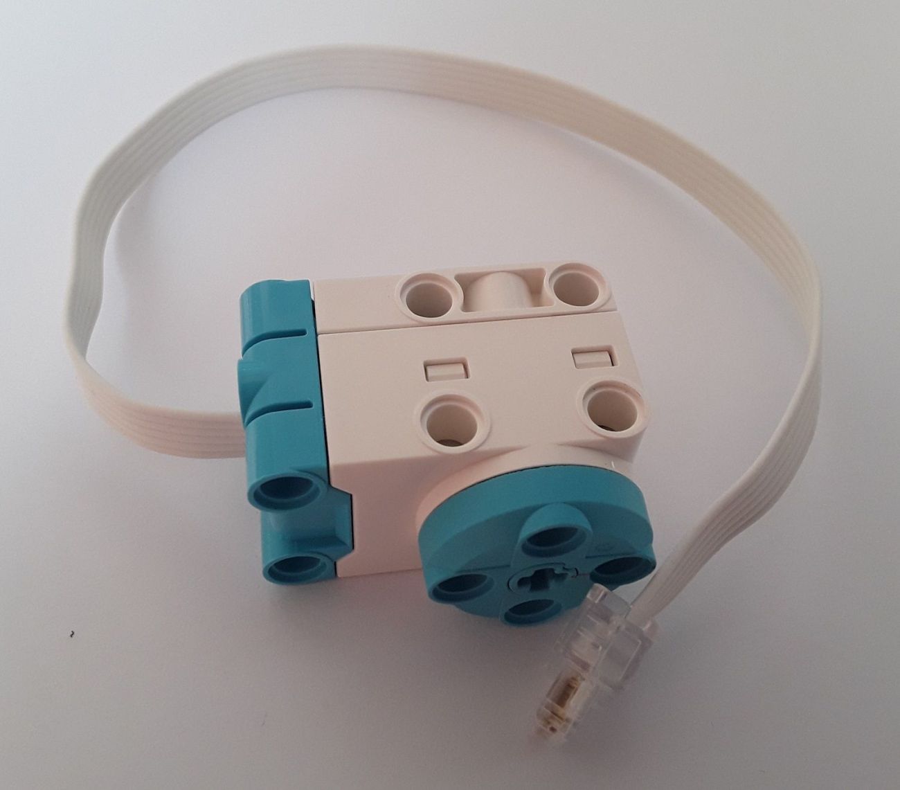 Ebenfalls neu ist der hellblaue kleine Winkelmotor, der gleich zwei Mal im Set enthalten ist. Sein Volumen dürfte mit dem Volumen des Power Functions M-Motors vergleichbar sein. Allerdings hat dieser Motor viel mehr Technic-Aufnahmen, was das Verbauen des Motors leichter macht. Dieser Motor enthält einen Rotationssensor, der Winkel und Geschwindigkeit der vom Motor gedrehten Scheibe messen kann. Dadurch kann er beispielsweise für Lenkungen von Fahrzeugen genutzt werden. Außerdem kann man den Motor per Hand drehen und ihn so als Sensor nutzen. Die absolute 0-Position ist mit einem grauen Strich markiert.