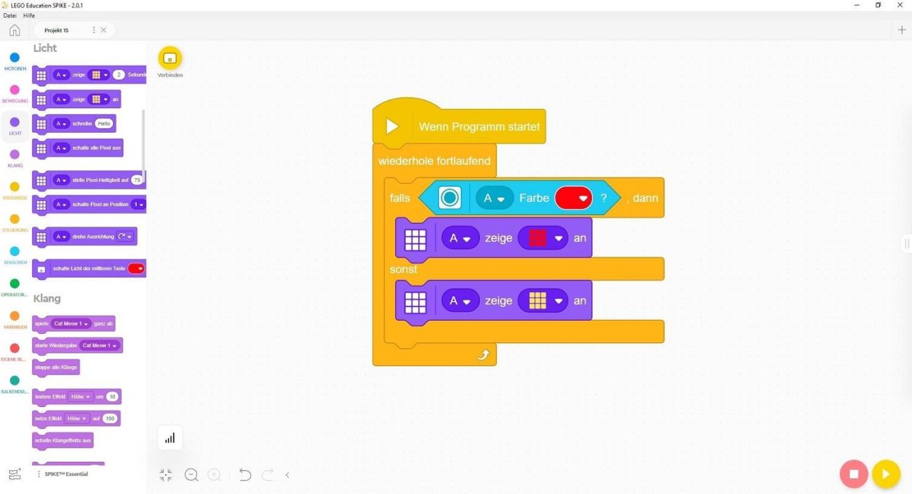 Für den Farbsensor und die 3×3 Matrix fehlen Programmierblöcke in der Powered Up App. Die Mindstorms App unterstützt den Farbsensor natürlich, da der Sensor auch im 51515 Mindstorms Roboter Erfinder-Set enthalten ist, aber die 3×3 Matrix fehlt dort bisher. Der neue Hub lässt sich nur mit der SPIKE App programmieren.