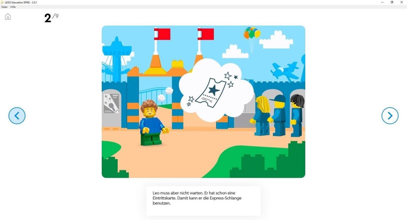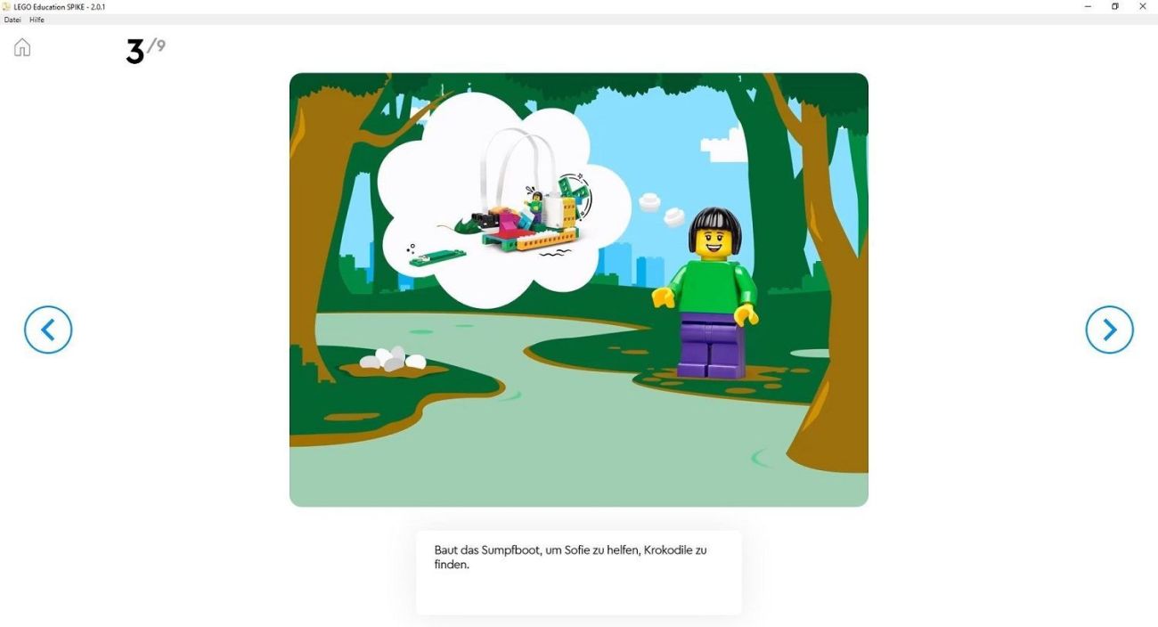 Startet man eine Lerneinheit, gibt es eine kurze Einführung in das Problem, die mit den vier Minifiguren erzählt wird. Dann gibt es eine Bauanleitung und eine geführte Programmieranleitung für ein einfaches Programm. Anschließend können Modell und Programm verbessert werden.