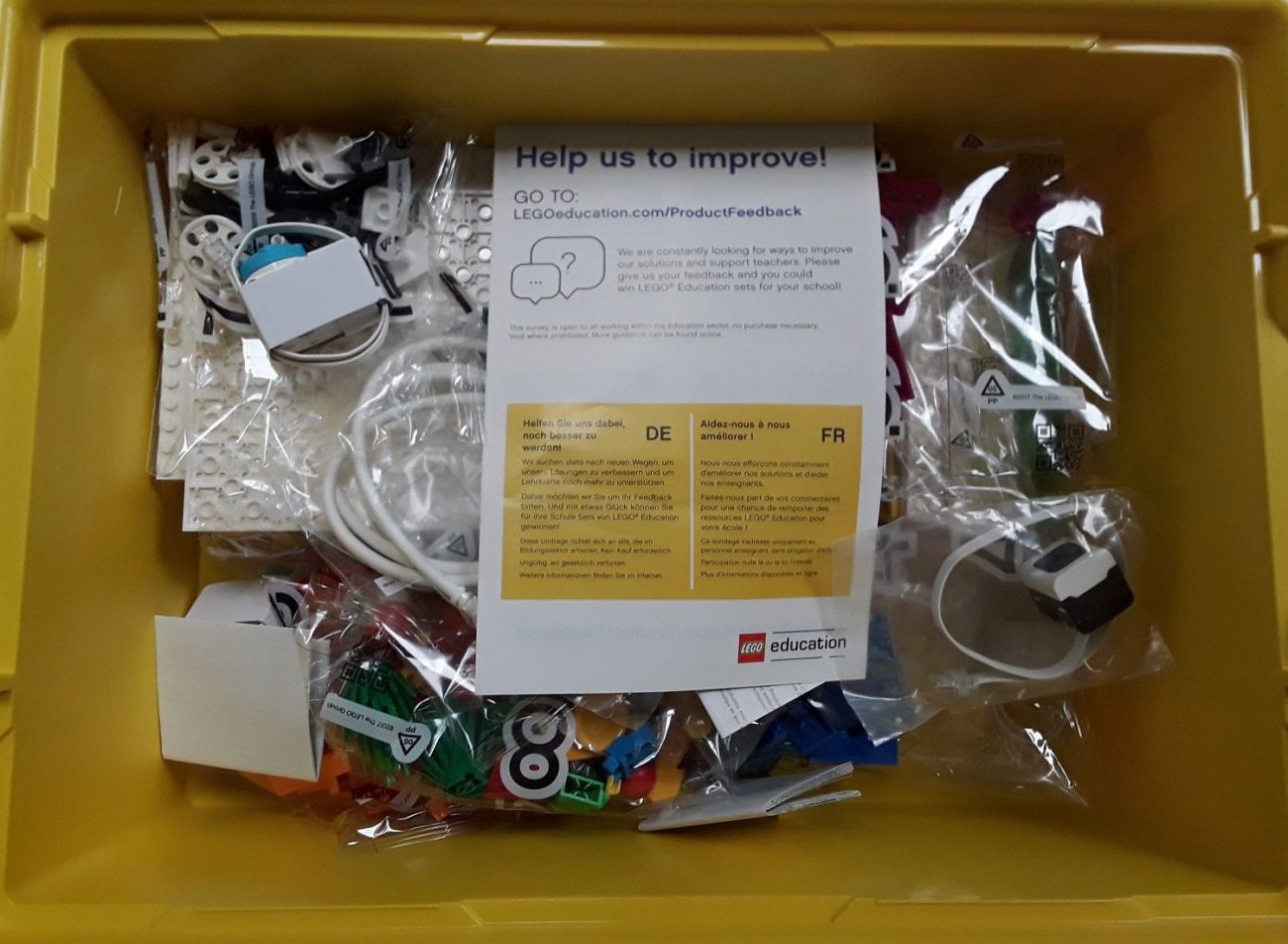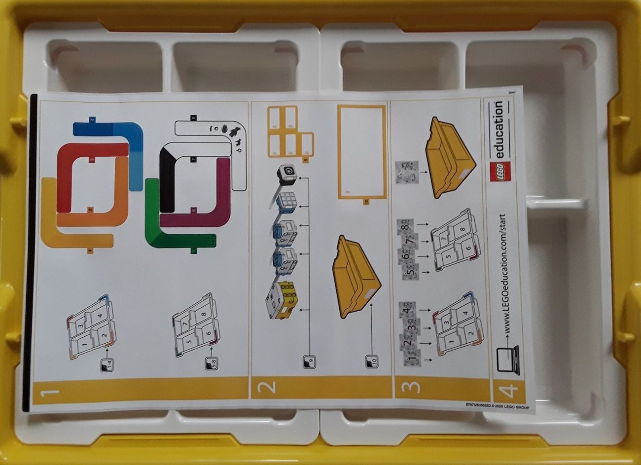 Nach dem Öffnen liegen ein paar Papierzettel in dem Kasten. Wichtig ist eine Auflistung der Sortierung der Teile. Es gibt außerdem einen Flyer mit der Bitte, Feedback für das Produkt zu hinterlassen und sich bei Problemen an den Kundenservice zu wenden. Austauschen kann man sich mit anderen Lehrern auch über das LEGO Education Forum.